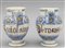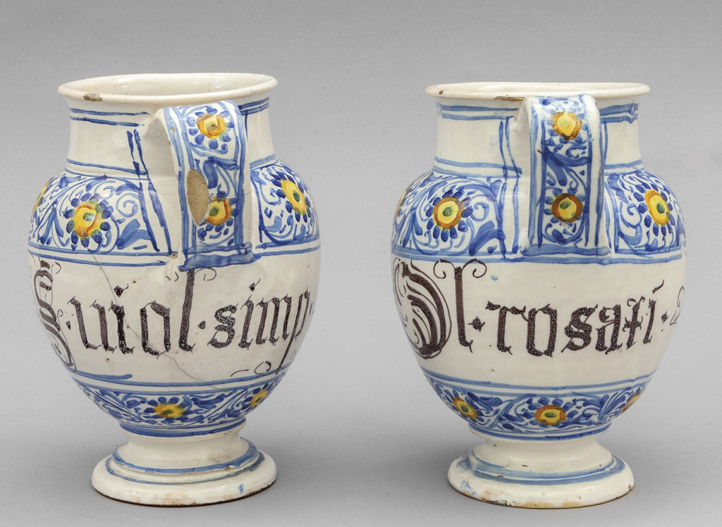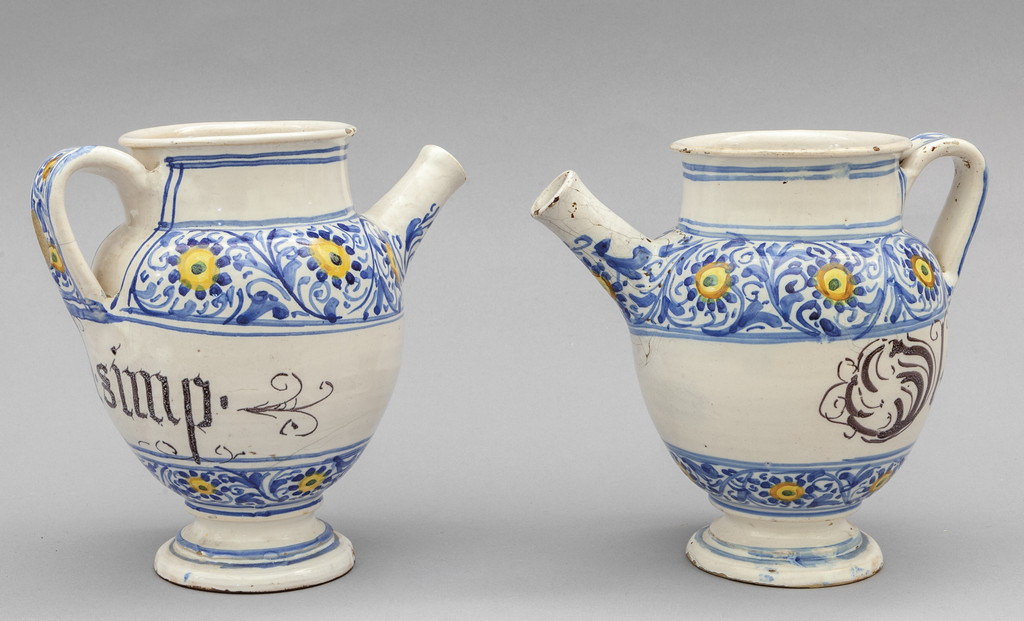 Coppia di versatoi a decoro giallo e blu con sctitta medicinale, Faenza sec.XVIII