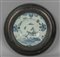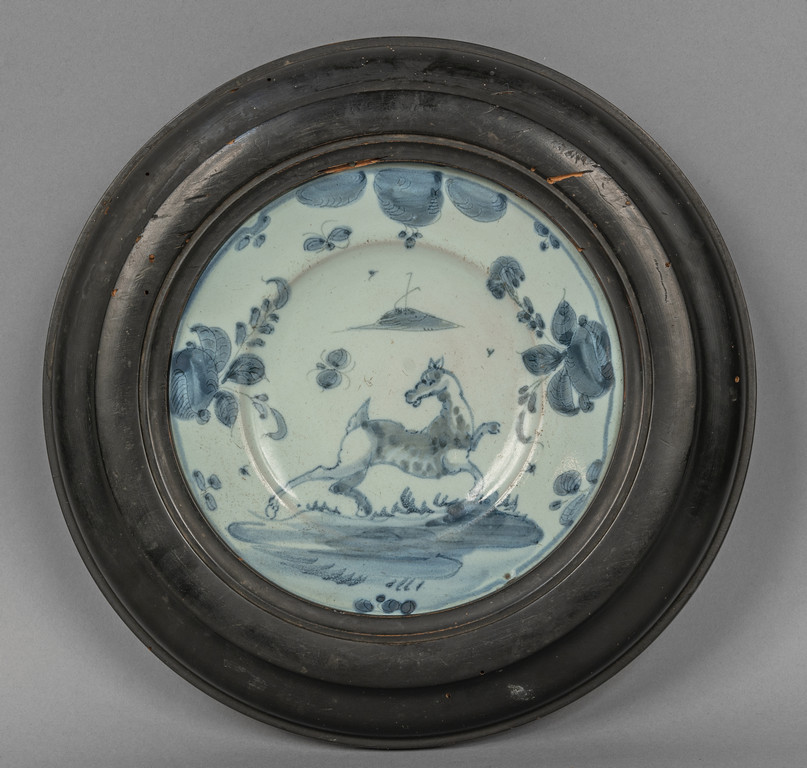 Piatto in ceramica di Savona decorato a tappezzeria con animale nel cavetto, marca Corona sec.XVIII