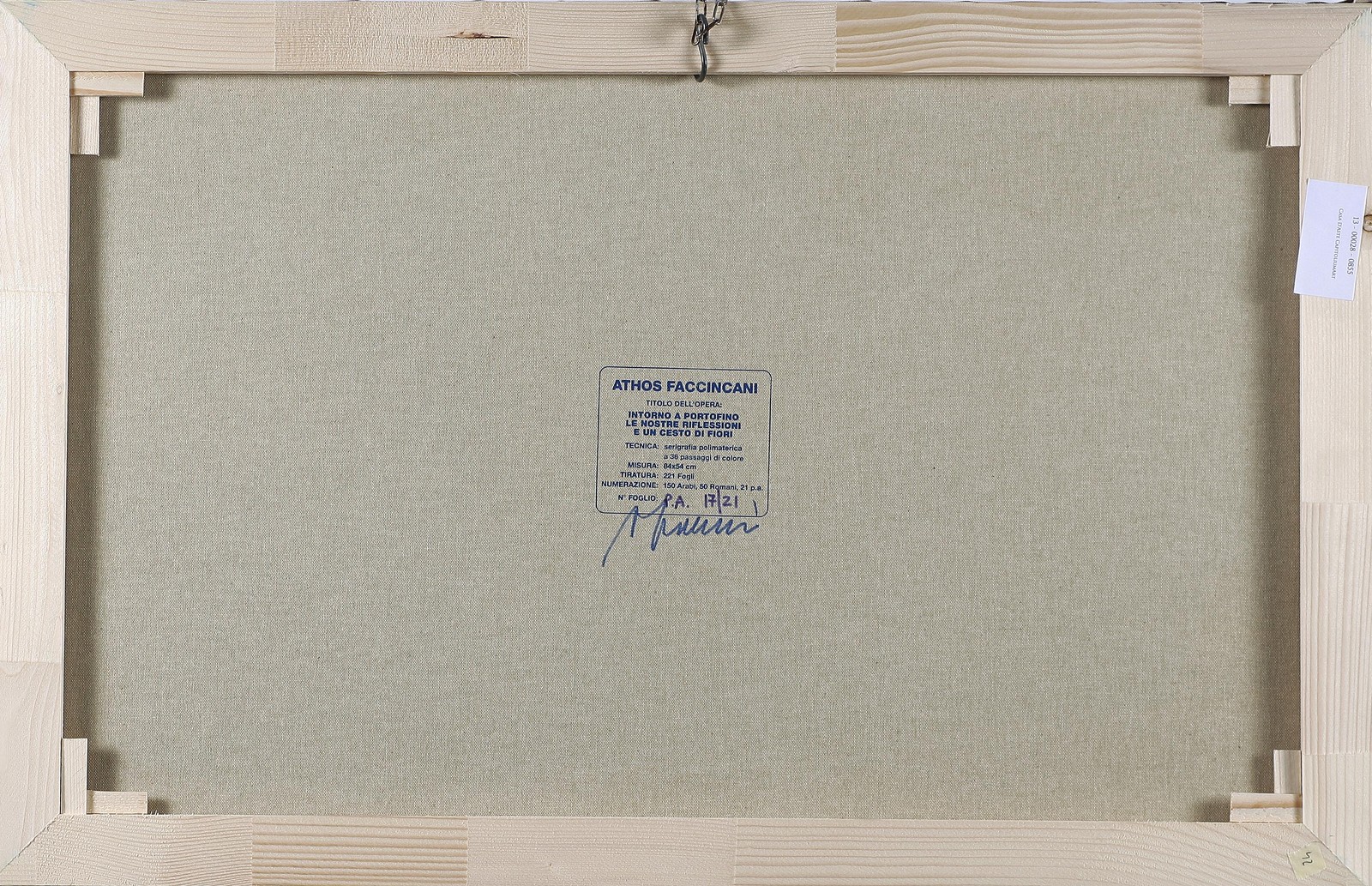 FACCINCANI ATHOS (n. 1951) Intorno a Portofino le nostre riflessioni e un cesto di fiori. Serigrafia su tela. Cm 84,00 x 54,00. Edizione 150+L+21 P.A. Esemplare: P.A. 17. Firma e tiratura in basso a pennarello.