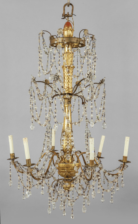 Lampadario Luigi XVI a sei luci, fusto in legno intagliato e dorato, ricca decorazione in cristalli, Genova inizi sec.XIX