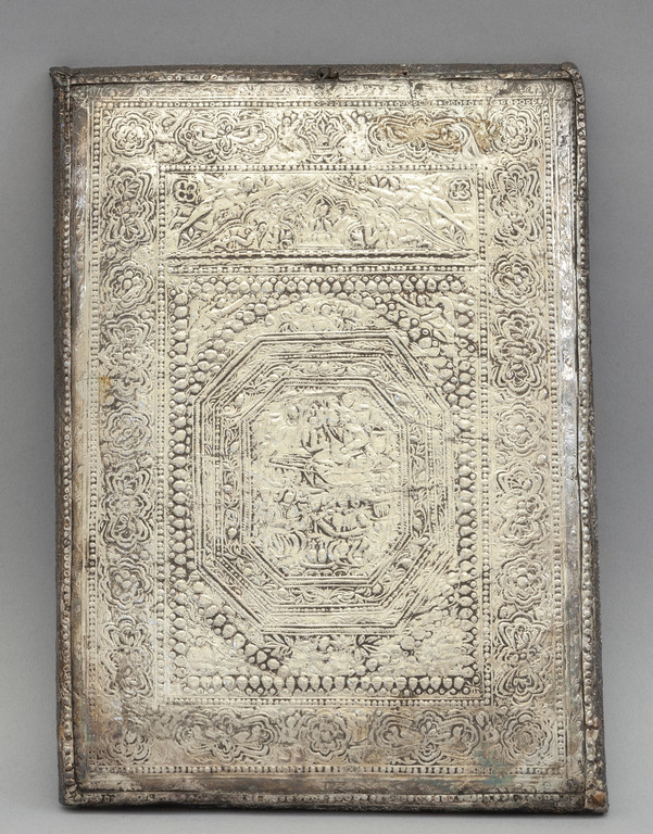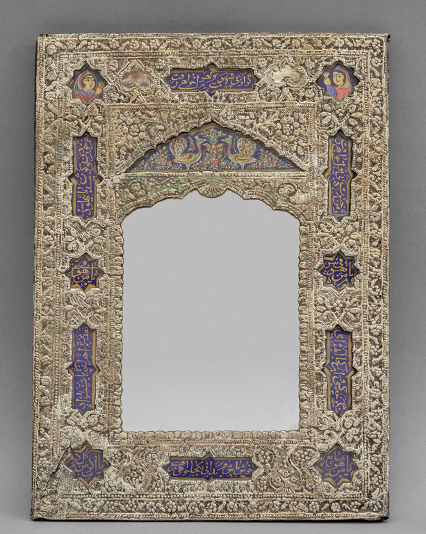 Piccola specchiera orientale in argento finemente sbalzato da entrambi i lati, la cornice che racchiude lo specchio è contornata da miniature e scritte