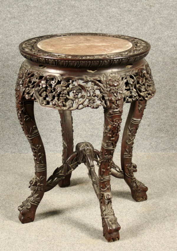 Firmato, datato. Trespolo portavaso in legno intagliato con piano in marmo. Cina. XIX secolo. Mis. Alt. cm. 62 Diam. cm. 44 ca.