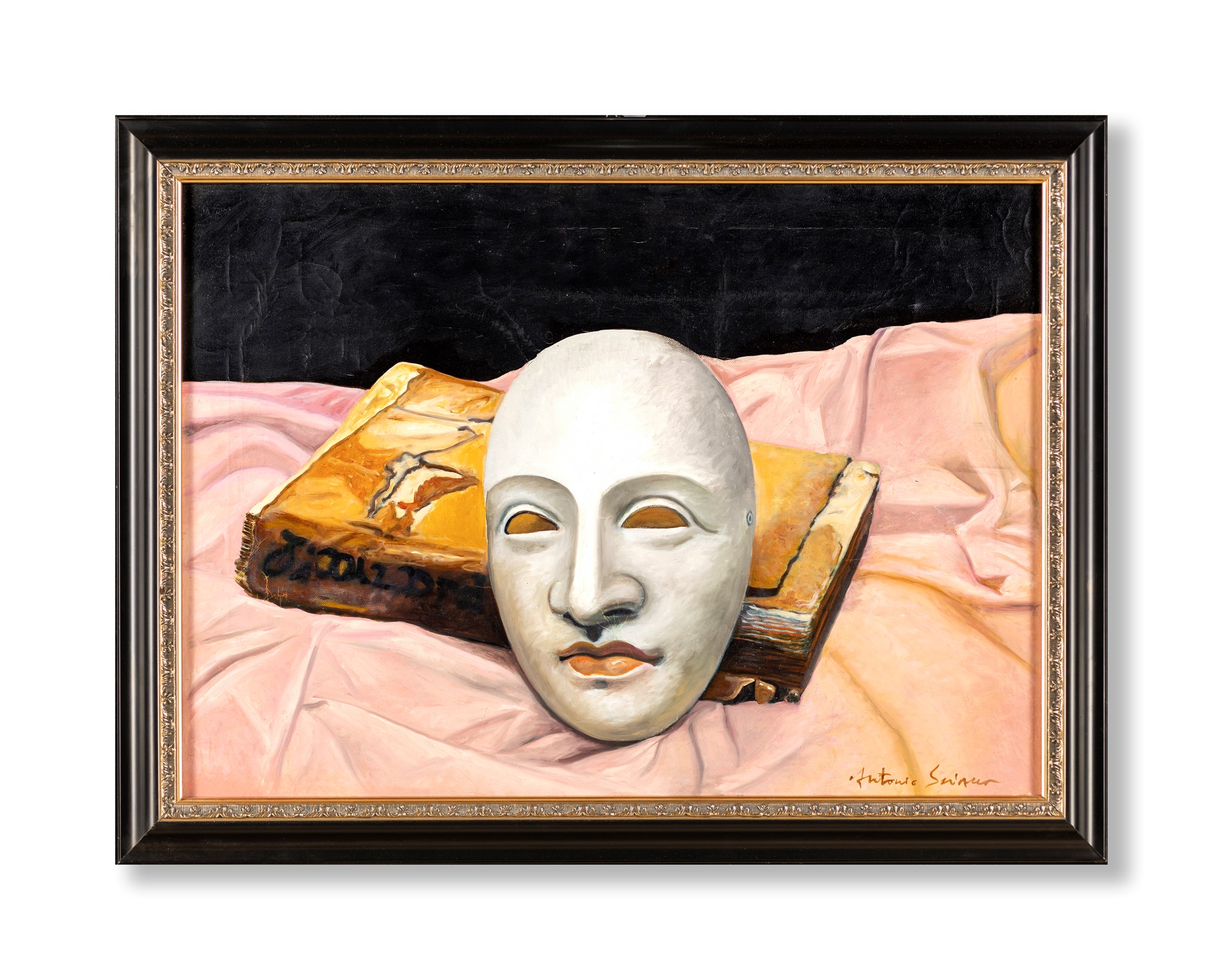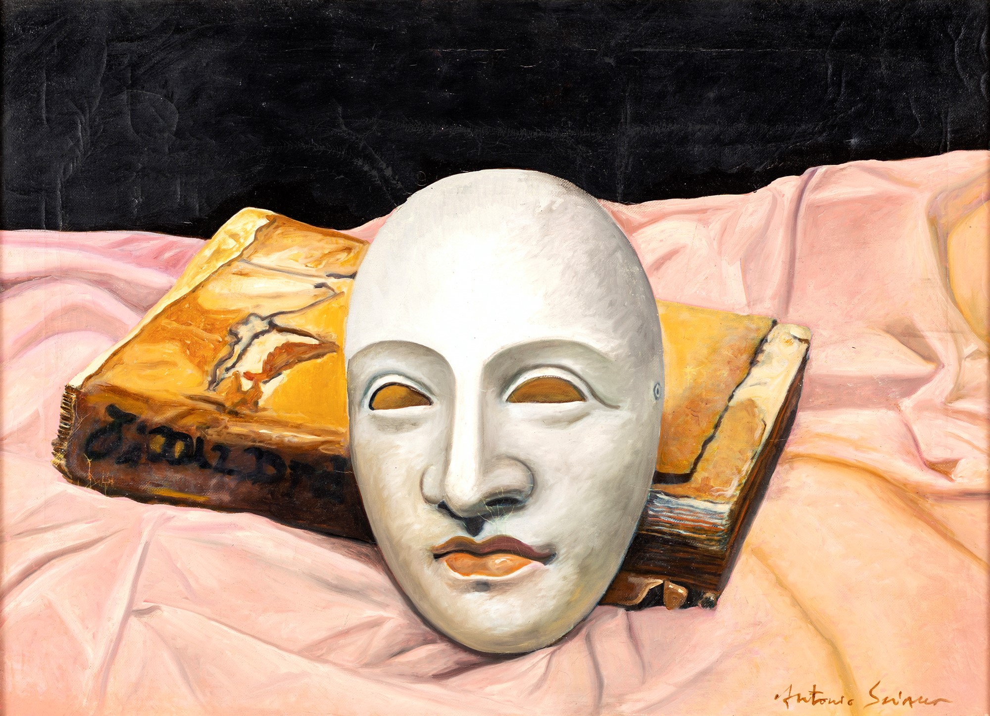 Antonio Sciacca - Libro e Maschera - Firma in basso a destra. Al verso reca titolo e autentica di pugno dell'autore. - Olio su tela - 50x70 - 1969