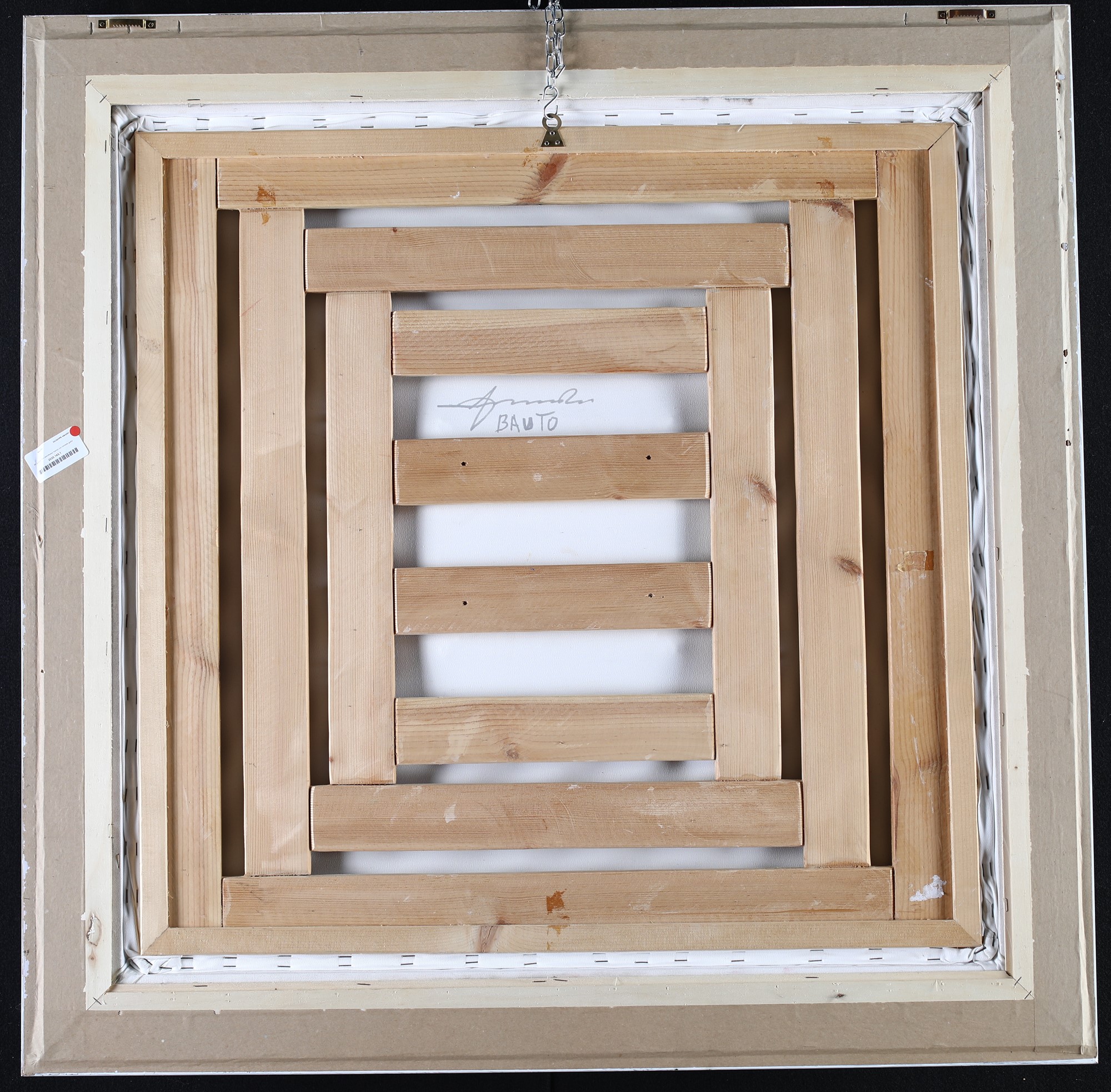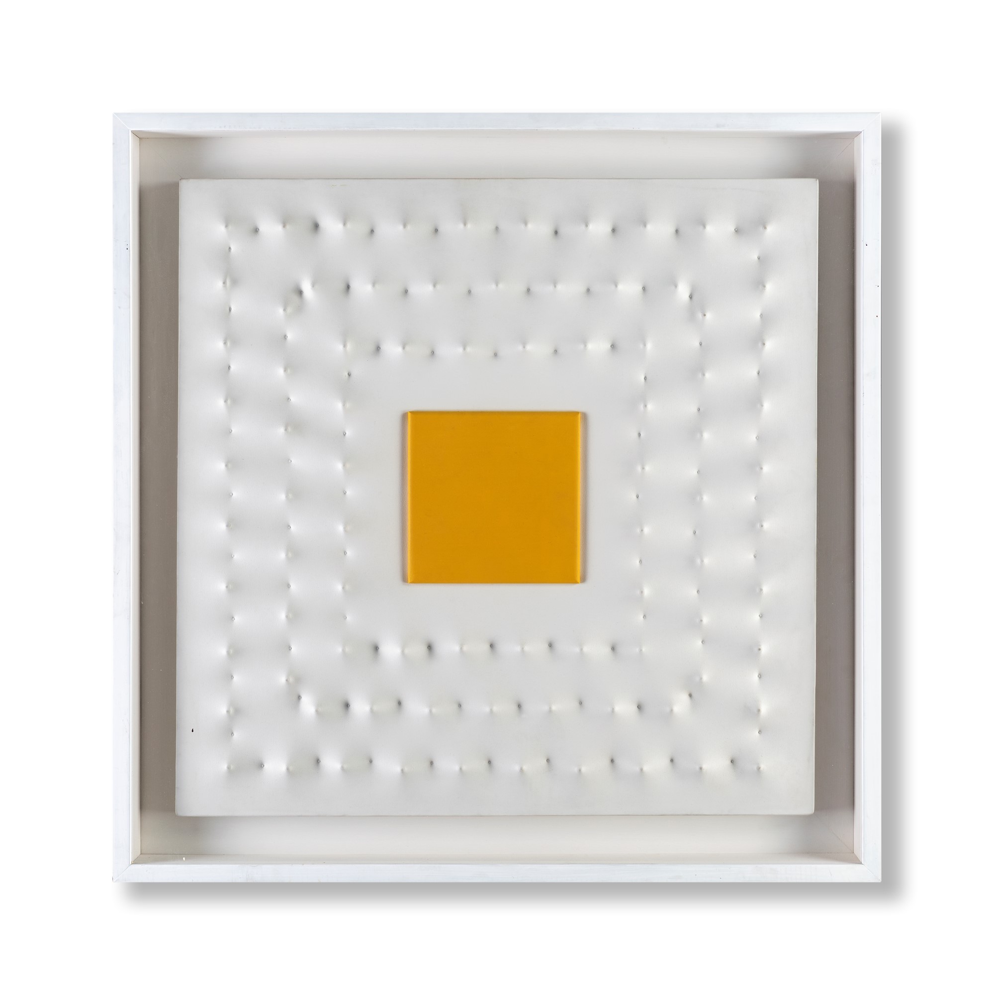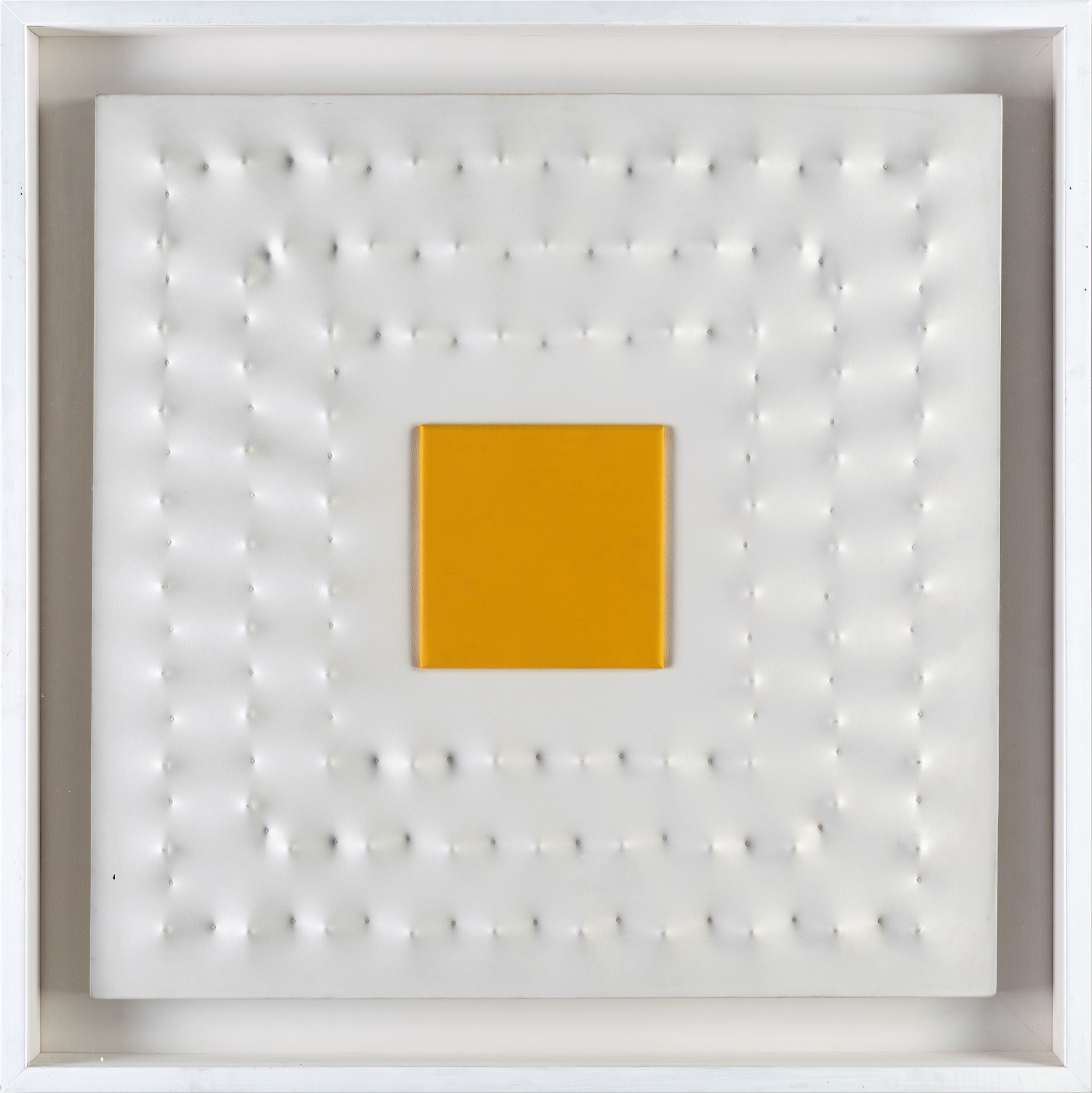 Giuseppe Amadio - Bauto - Al verso reca firma e titolo. - Tela estroflessa bianca con formella gialla - 85,5x85,5 -
