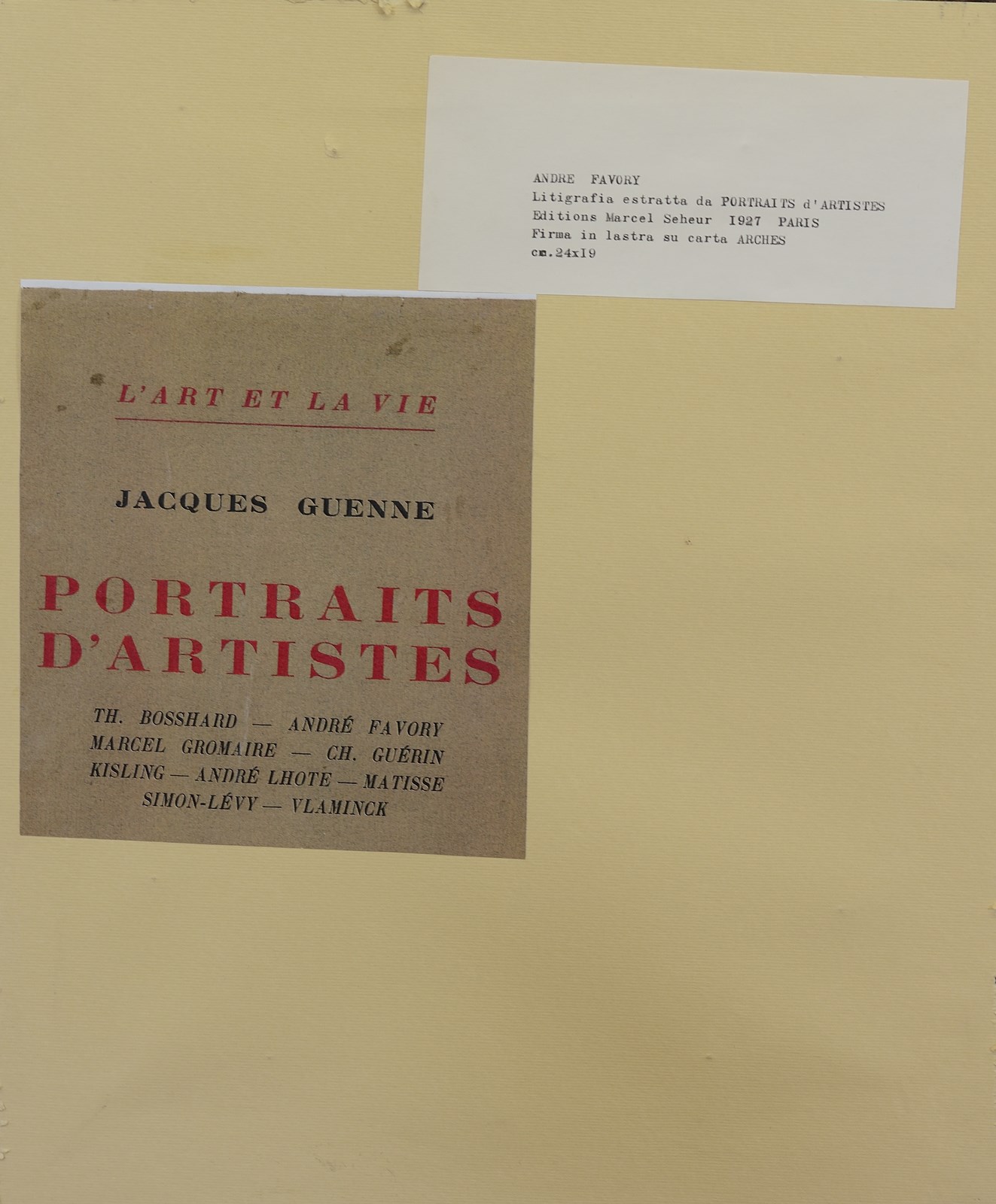 FAVORY ANDRE' (1888 - 1937) Senza titolo. . 1927. stampa litografica. Cm 19,00 x 24,00. Stampa litografica estratta dal volume "Portrait d'artistes" ed. 1927 su carta Velin d'Arches. Firma a stampa in basso al centro. Cornice presente