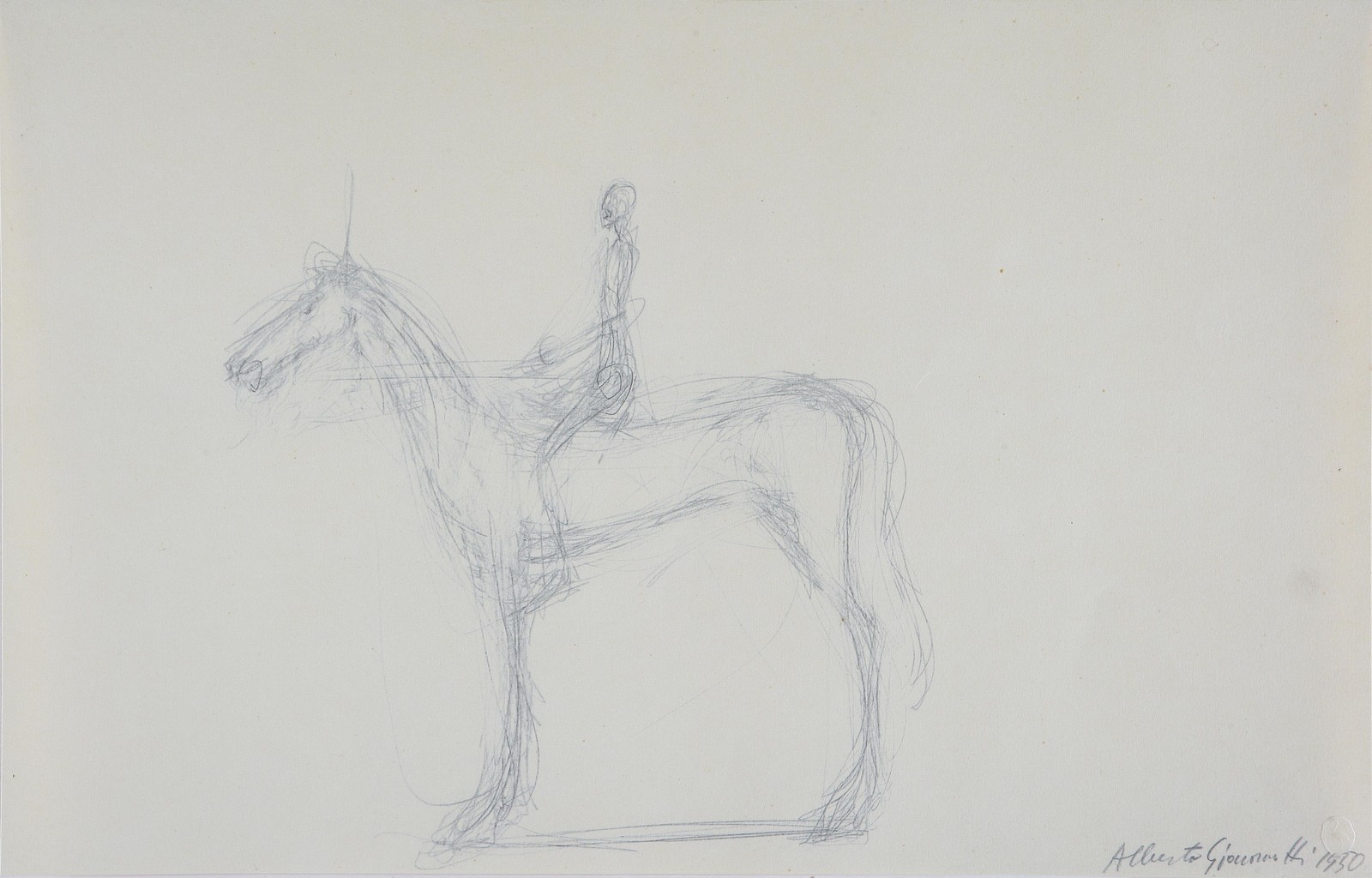 GIACOMETTI ALBERTO (1901 - 1966) Cavallo e cavaliere. 1963. Fotolitografia. Cm 50,00 x 33,00. Opera conservata nella sua cartella originale (cm 45x56) , numerata a stampa col numero 13, proveniente dall'album - Quarantacinque disegni di Alberto Giacometti - stampato da Einaudi Editore, Torino nel 1963, in 1250 esemplari. In basso a destra reca il timbro a secco dell'editore rappresentante uno struzzo con la scritta - spiritus durissima coquit. Firma e anno (del disegno originale) in basso a destra.