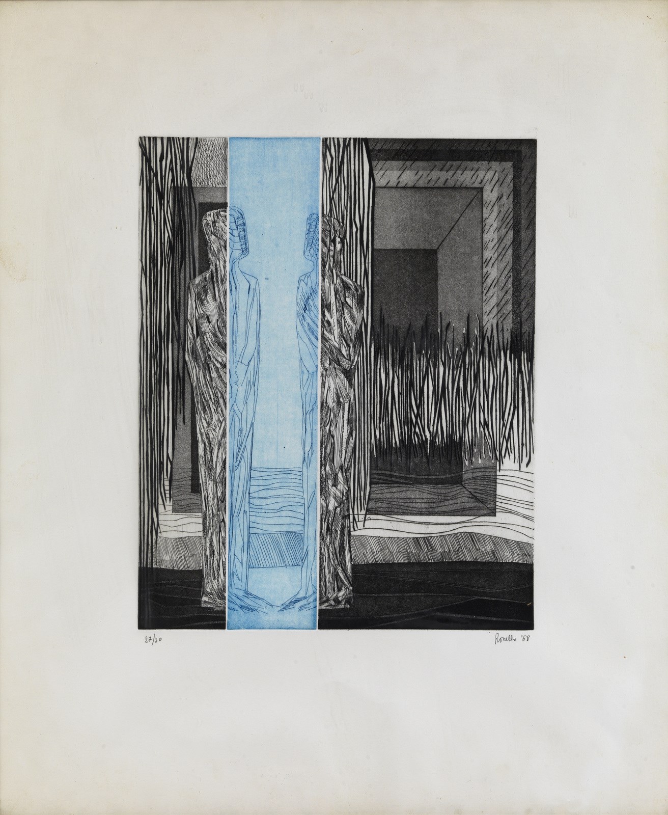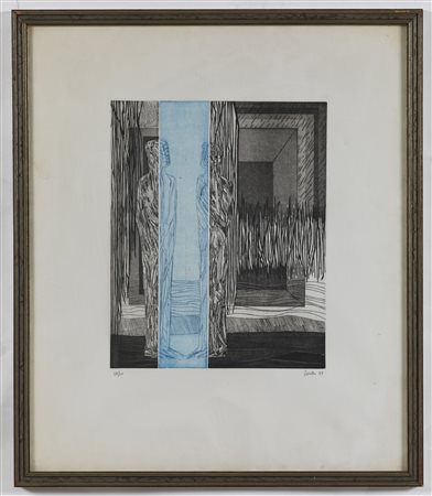 ROSSELLO MARIO (1927 - 2000) Senza titolo. 1968. Acquaforte e acquatinta. Cm 49,00 x 58,00. 27/30. Tiratura, firma e anno in basso a matita. Dimensione lastra: 35x28 cm. Cornice presente