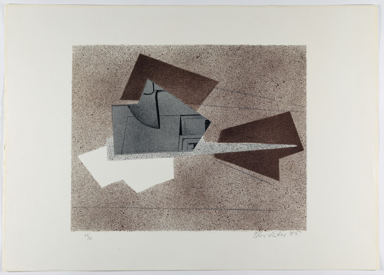 RICHTER HANS (1888 - 1976) Composition. 1975. Litografia. Cm 70,00 x 50,00. 68/90. Tiratura, firma e anno in basso a matita. Timbro a secco Pergola Edizioni in basso a sinistra. Al retro cartiglio descrittivo della Galleria Studio F22, Palazzolo (Bs). Cornice presente