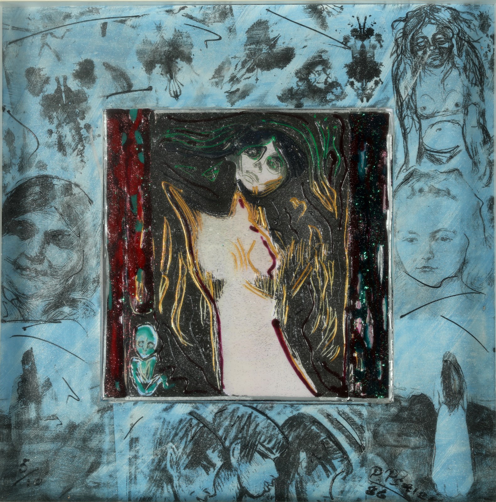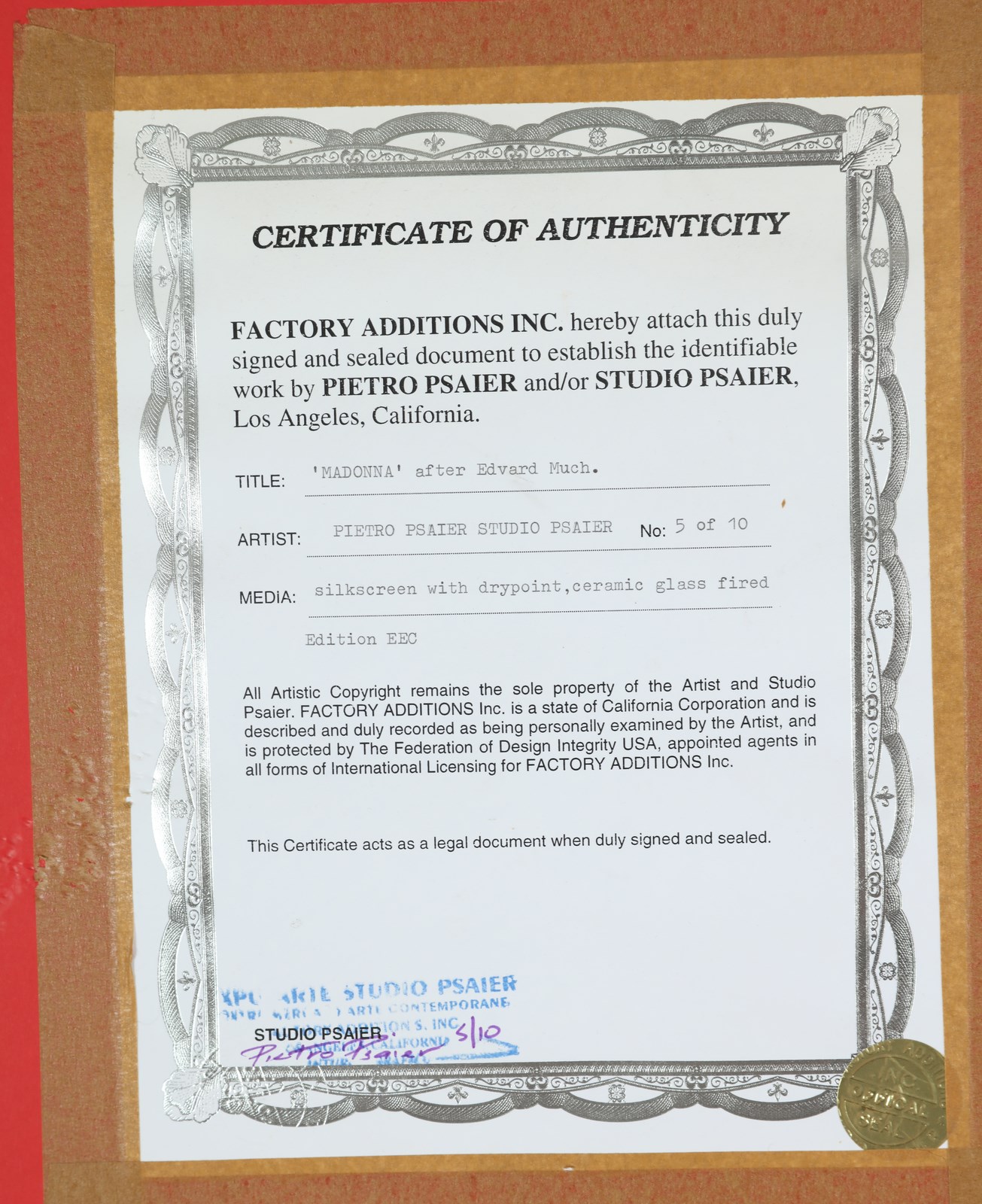 PSAIER PIETRO (1939 - 2004) Madonna after Eduard Much. 1988. Serigrafia e collage. Cm 50,00 x 50,00. 5/10. Tiratura, firma e anno in basso. Al retro certificato di autenticità con timbro e firma dell'artista. Cornice presente