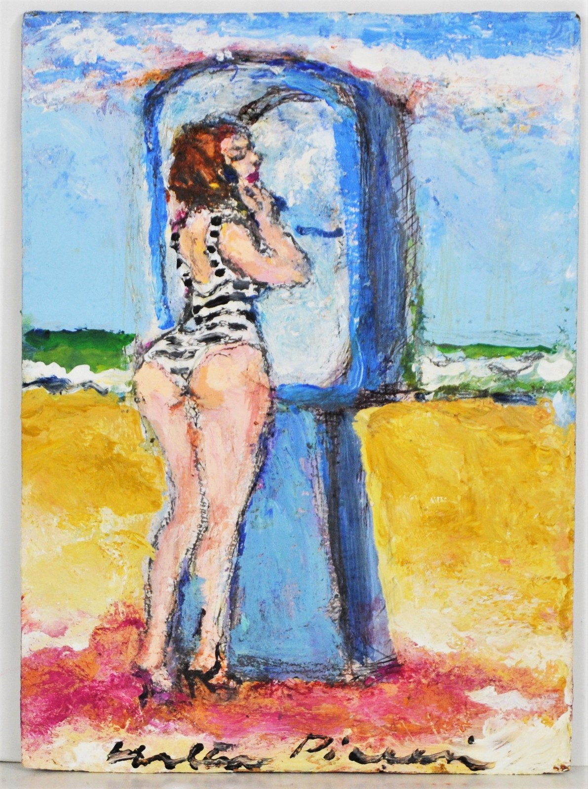 PIACESI WALTER (n. 1929) Telefono all'aperto. 2012. Olio su faesite. Cm 13,00 x 18,00. Firma in basso al centro. Al retro titolo, firma e anno. Autentica dell'artista su fotografia.