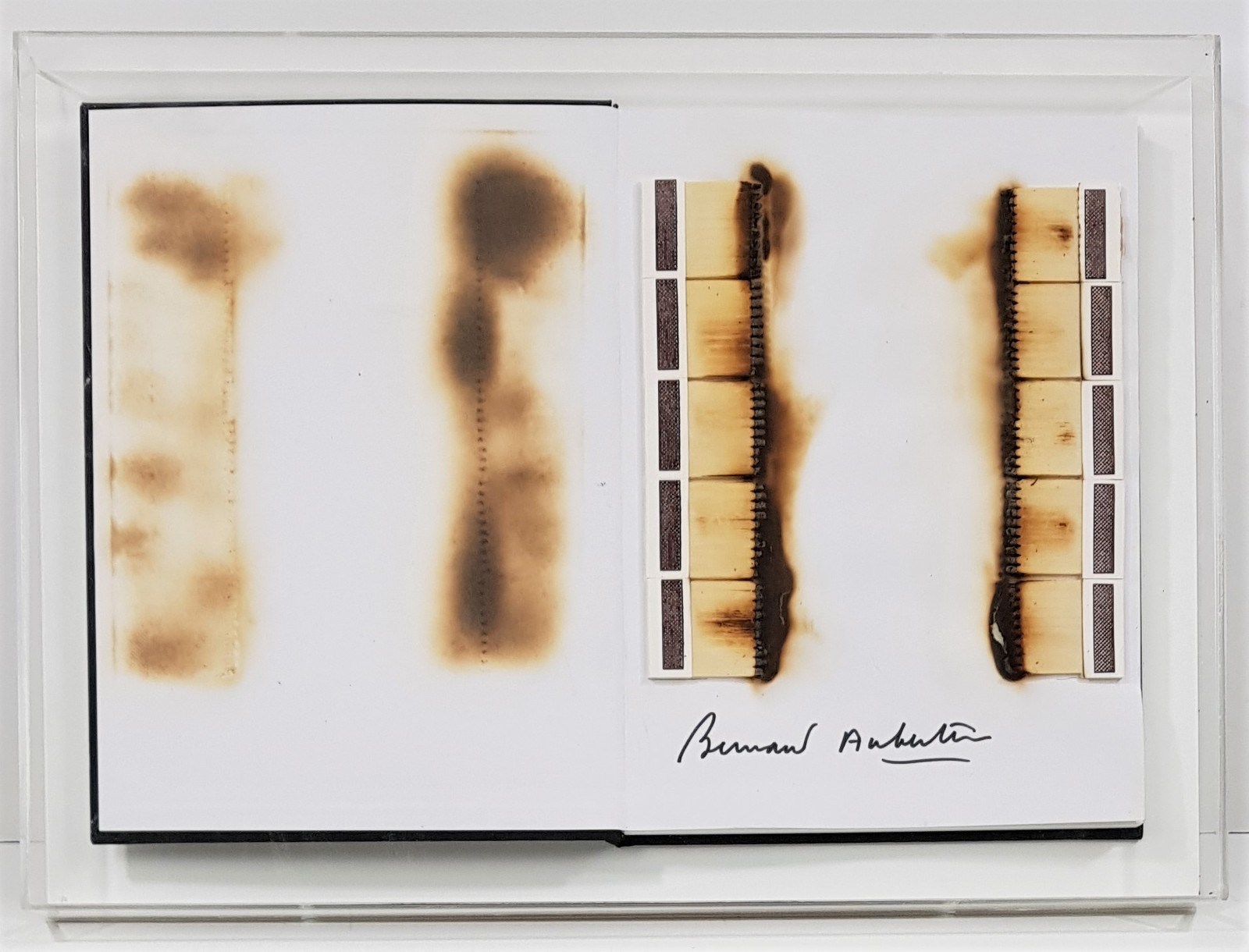 AUBERTIN BERNARD (1934 - 2015) Senza titolo. Fiammiferi bruciati su catalogo. Cm 45,00 x 31,00. Firma in basso a destra. Opera archiviata presso la Galleria Rosenberg, Milano come da documentazione fotografica allegata all'opera riportante il relativo numero d'inventario e la firma dell'artista. Entro teca di plexiglass.