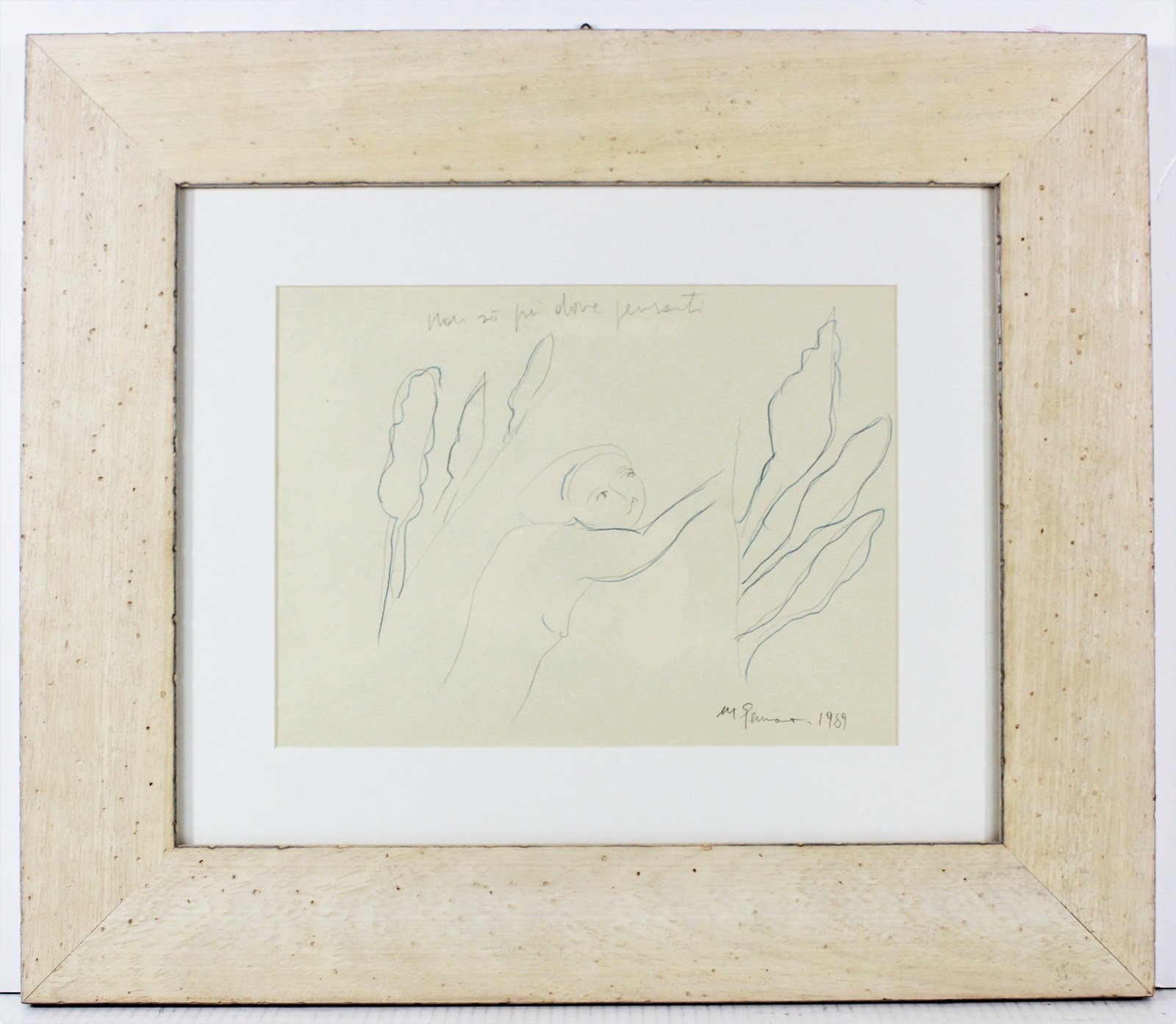 GERMANA' MIMMO (1944 - 1992) Non so più dove pensarti. 1989. Tecnica mista su carta. Cm 32,00 x 24,00. Firma e anno in basso a destra, titolo in alto a sinistra. Opera archiviata presso l'Archivio Mimmo Germanà come da documentazione fotografica allegata all'opera riportante il relativo numero d'inventario e la firma dell'artista. Pubblicazione: Mimmo Germanà - sogni e disegni, Museo delle Arti/ Palazzo Bandera, Busto Arsizio, 1998, pag.96 (catalogo non incluso).