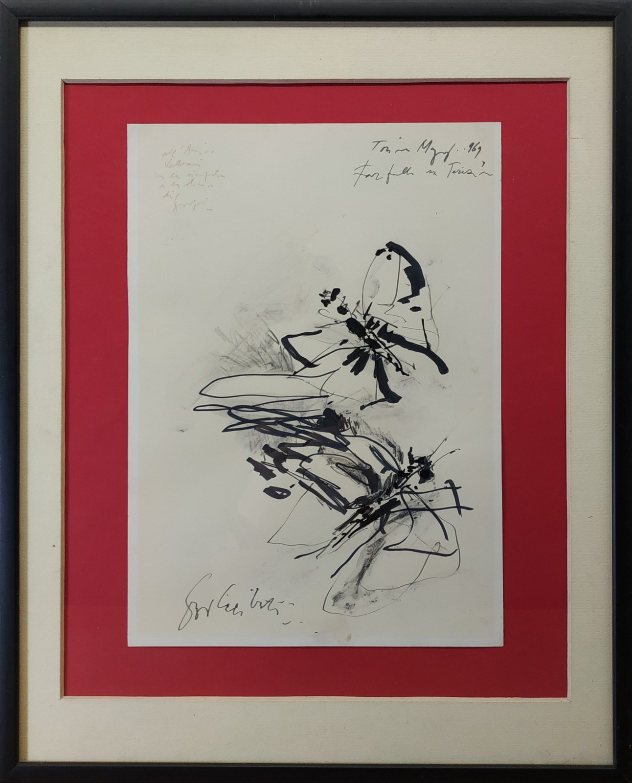CELIBERTI GIORGIO (n. 1929) Farfalle a Terezin. 1969. Tecnica mista su carta. Cm 25,00 x 35,00. Firma in basso a sinistra. Titolo e data in alto a destra. Cornice presente