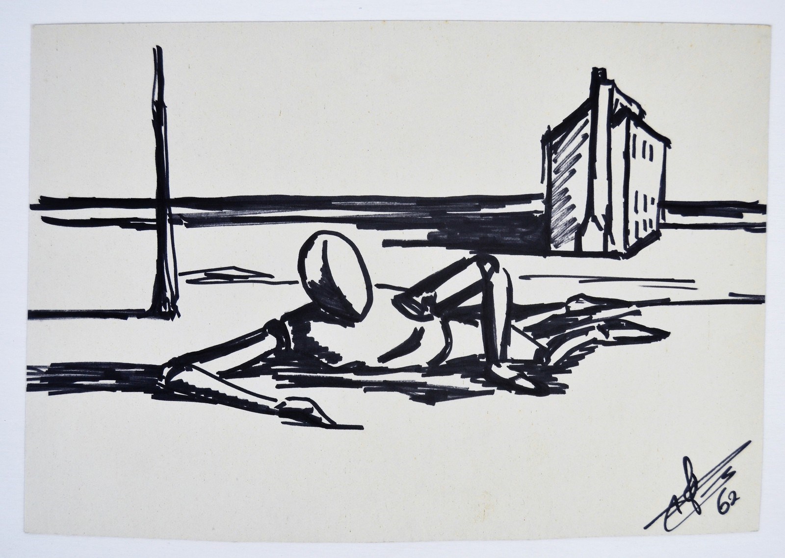 AUTORE NON IDENTIFICATO Senza titolo. 1962. Disegno su carta. Cm 31,00 x 21,50. Firma e anno in basso a destra.