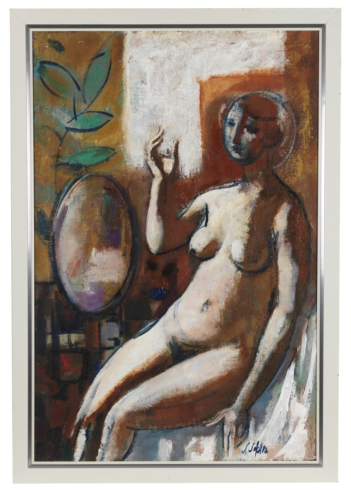 SOPELSA LUCIANO (n. 1921) Donna allo specchio. Olio su tela . Cm 80,00 x 120,00. Firma in basso a destra. Cornice presente