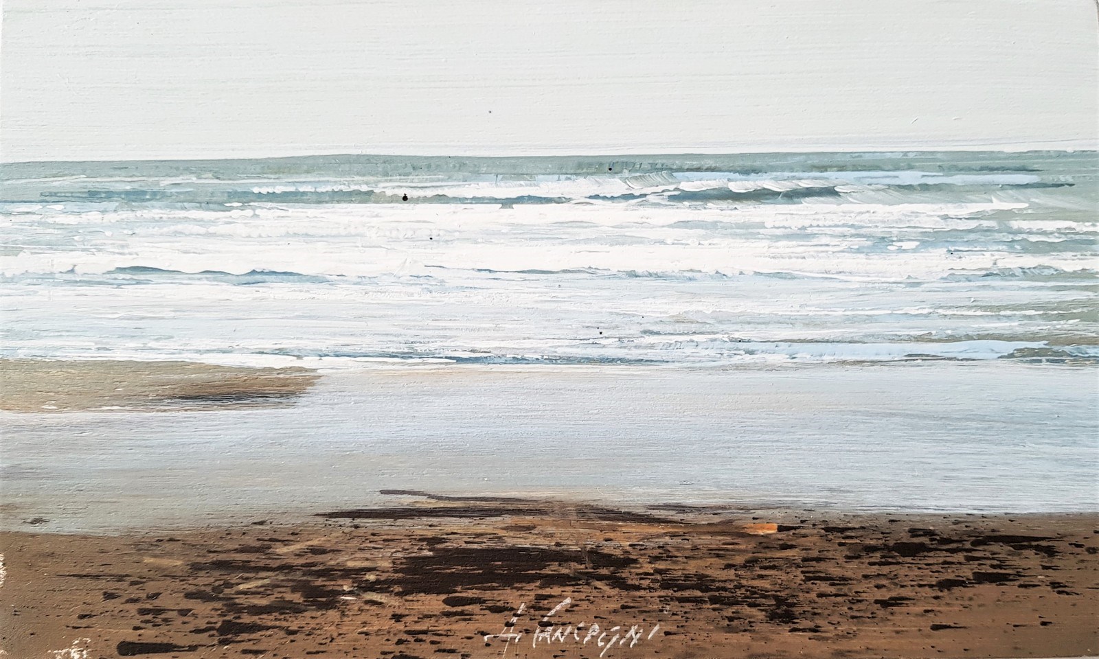 CANCOGNI AGOSTINO (n. 1950) Dopo la mareggiata. Olio su tavola. Cm 25,00 x 15,00. Firma in basso al centro. Al retro firma e titolo. Autentica dell'artista su fotografia.