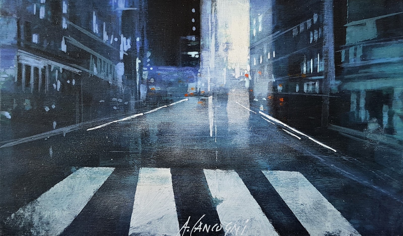 CANCOGNI AGOSTINO (n. 1950) Sera in città. Olio su tavola. Cm 25,00 x 15,00. Firma in basso al centro. Al retro firma e titolo. Autentica dell'artista su fotografia.