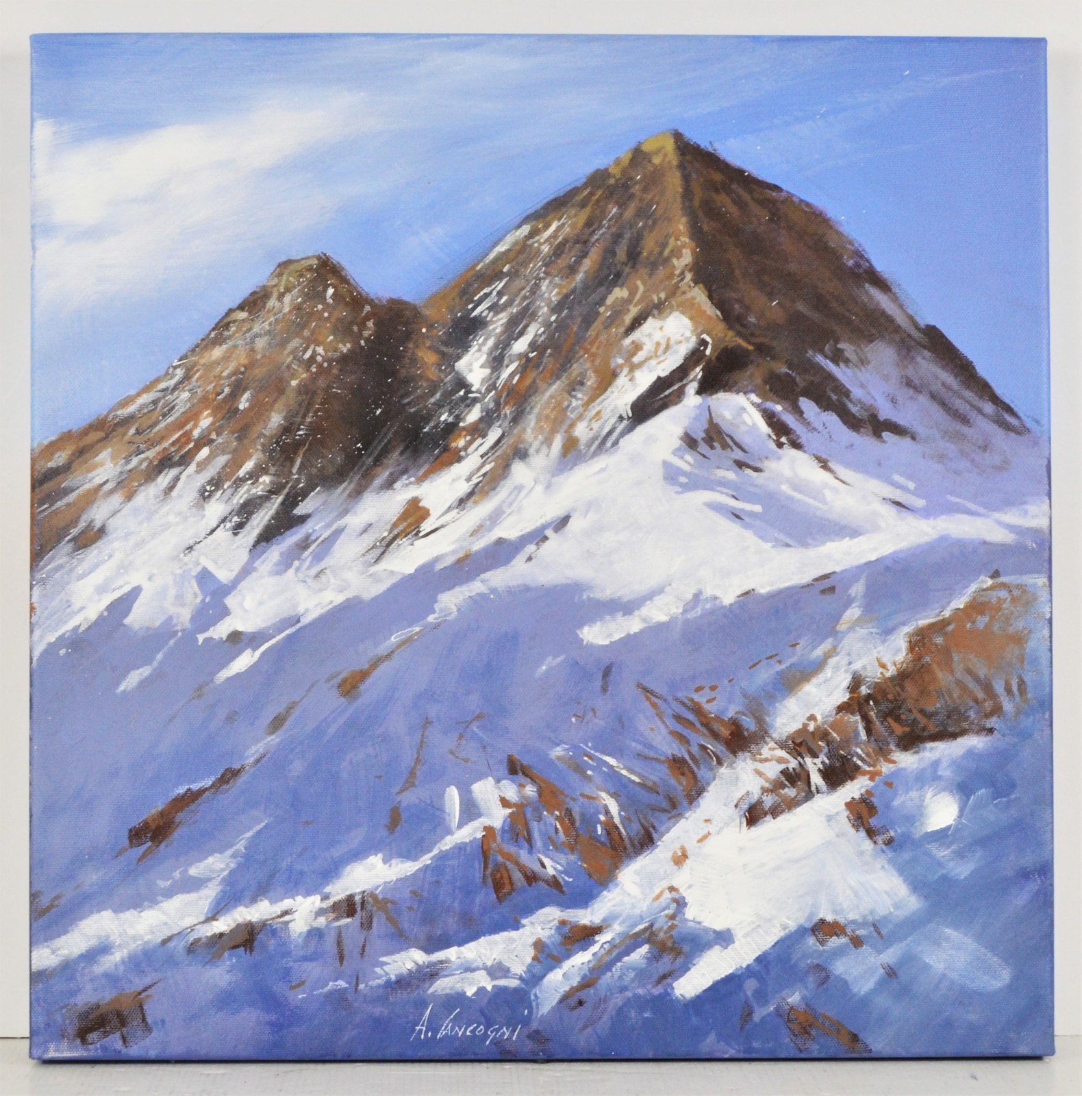 CANCOGNI AGOSTINO (n. 1950) La montagna. Olio su tela . Cm 50,00 x 50,00. Firma in basso al centro. Al retro firma e titolo. Autentica dell'artista su fotografia.