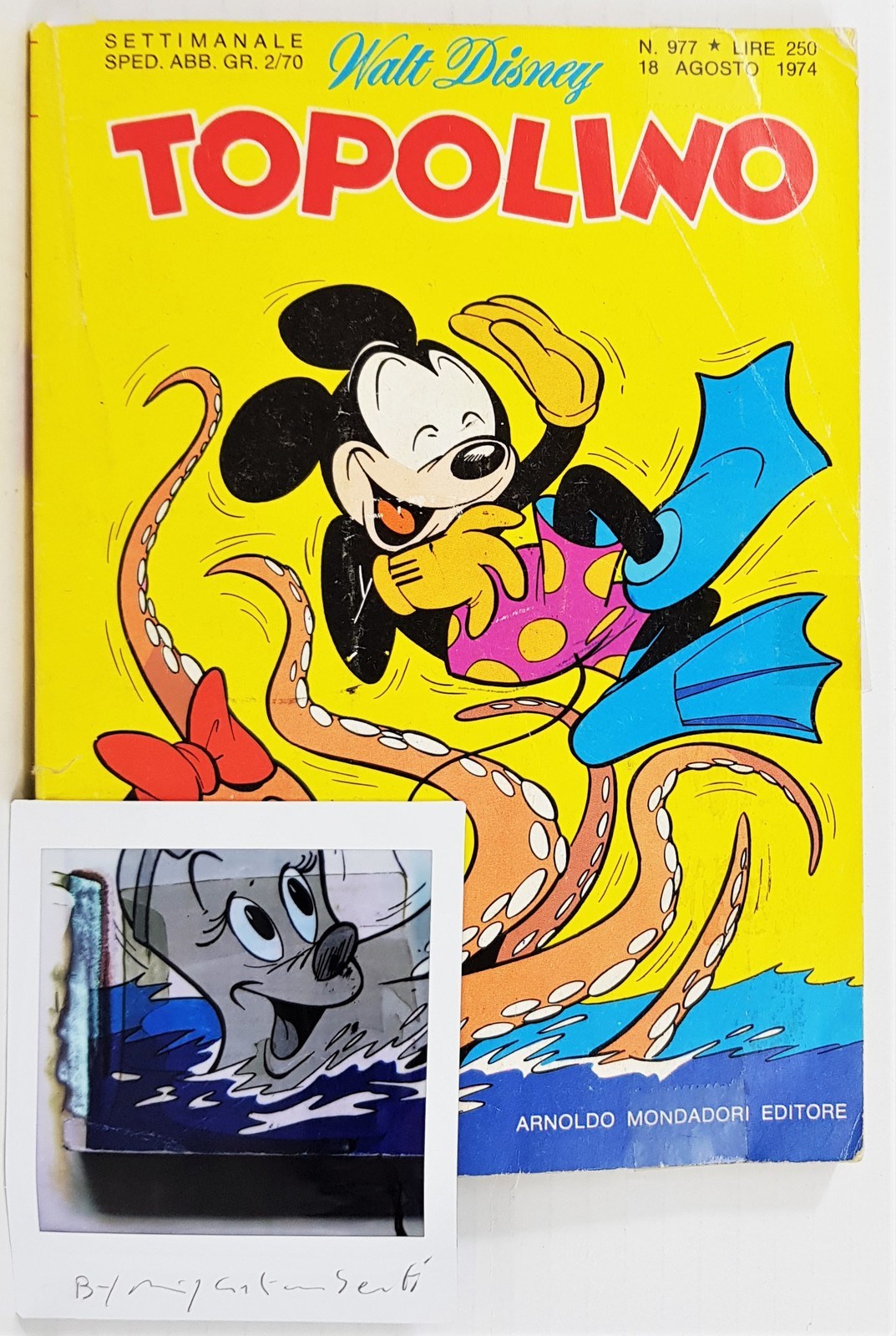 GALIMBERTI MAURIZIO (n. 1956) Topolino n.977. Polaroid e intervento su libro. Cm 14,00 x 20,00. Firma in sulla polaroid. Opera archiviata presso l'Archivio Nordest, Seregno come da documentazione fotografica allegata all'opera riportante il relativo numero d'inventario e la firma dell'artista.