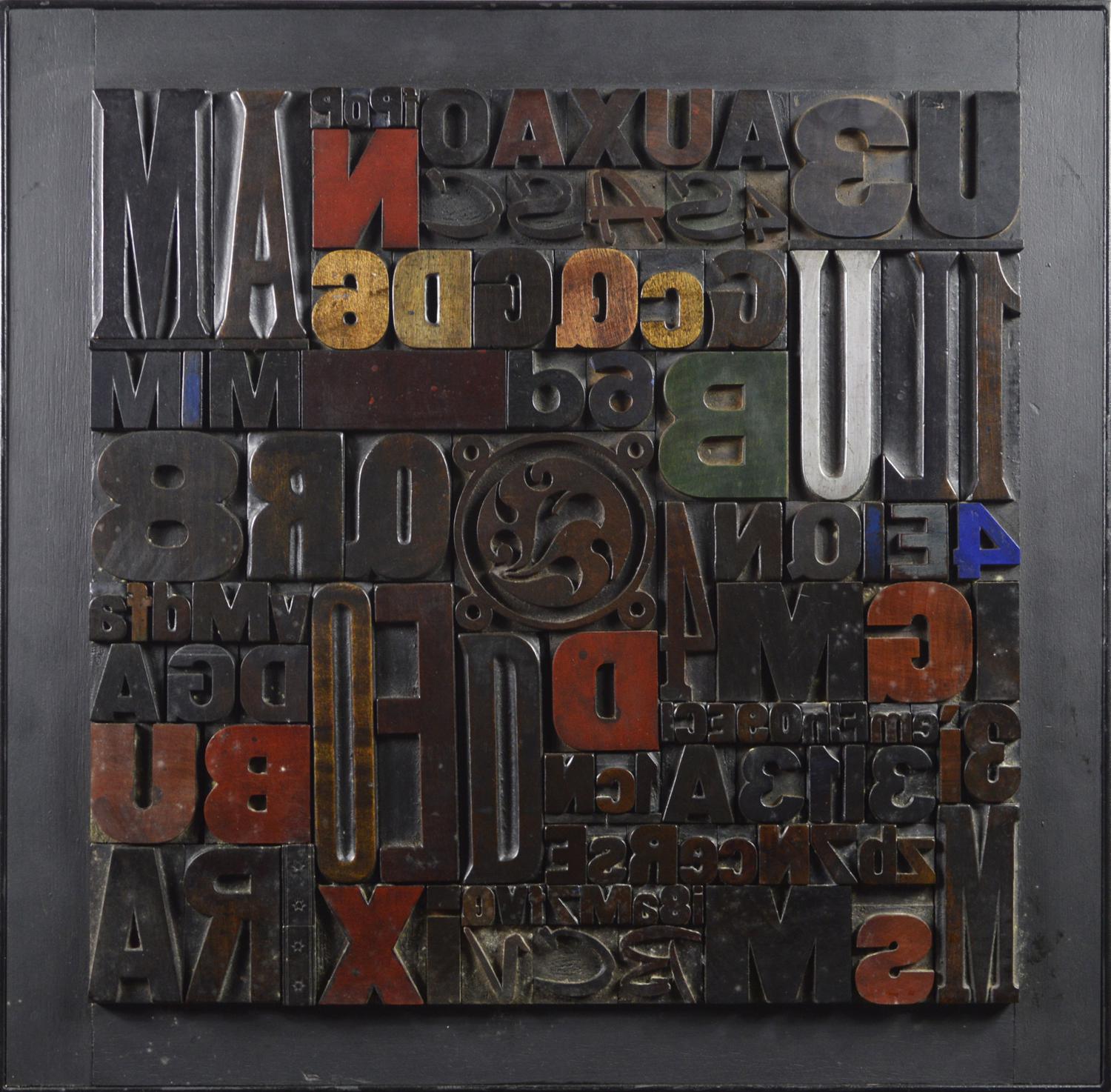 assemblaggio di caratteri tipografici di legno, cm 50x50