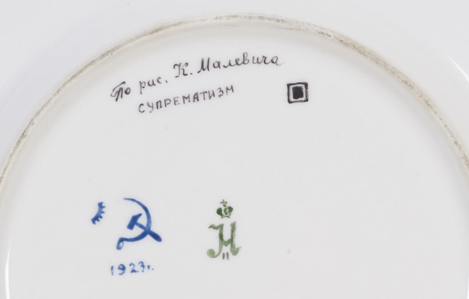 sul retro: 'po ris Malevicha' e 'Suprematismo' in cirillico, marchio del quadrato nero del movimento Suprematista; marchio del 1923 della Manifattura Statale di Porcellana in blu e monogramma dello zar Nicola II in verde