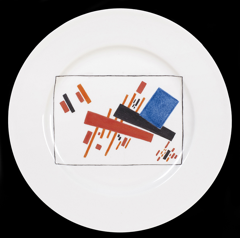 Il periodo suprematista risalente al 1923, quando fu realizzato questo piatto, è considerato il più sperimentale e innovativo di tutte le fasi della produzione della fabbrica. Durante questo periodo Sergei Chekhonin, direttore artistico della fabbrica, ha svolto un ruolo vitale nel coinvolgimento degli artisti d'avanguardia nel processo di produzione. Ha invitato artisti come Kazemir Malevich, Nikolai Suetin e Vassily Kandinsky per progettare piatti e tazze. I concetti dei Suprematisti sull'arte erano incentrati su forme geometriche astratte: il quadrato, il cerchio e la croce, che si adattavano perfettamente alla porcellana.