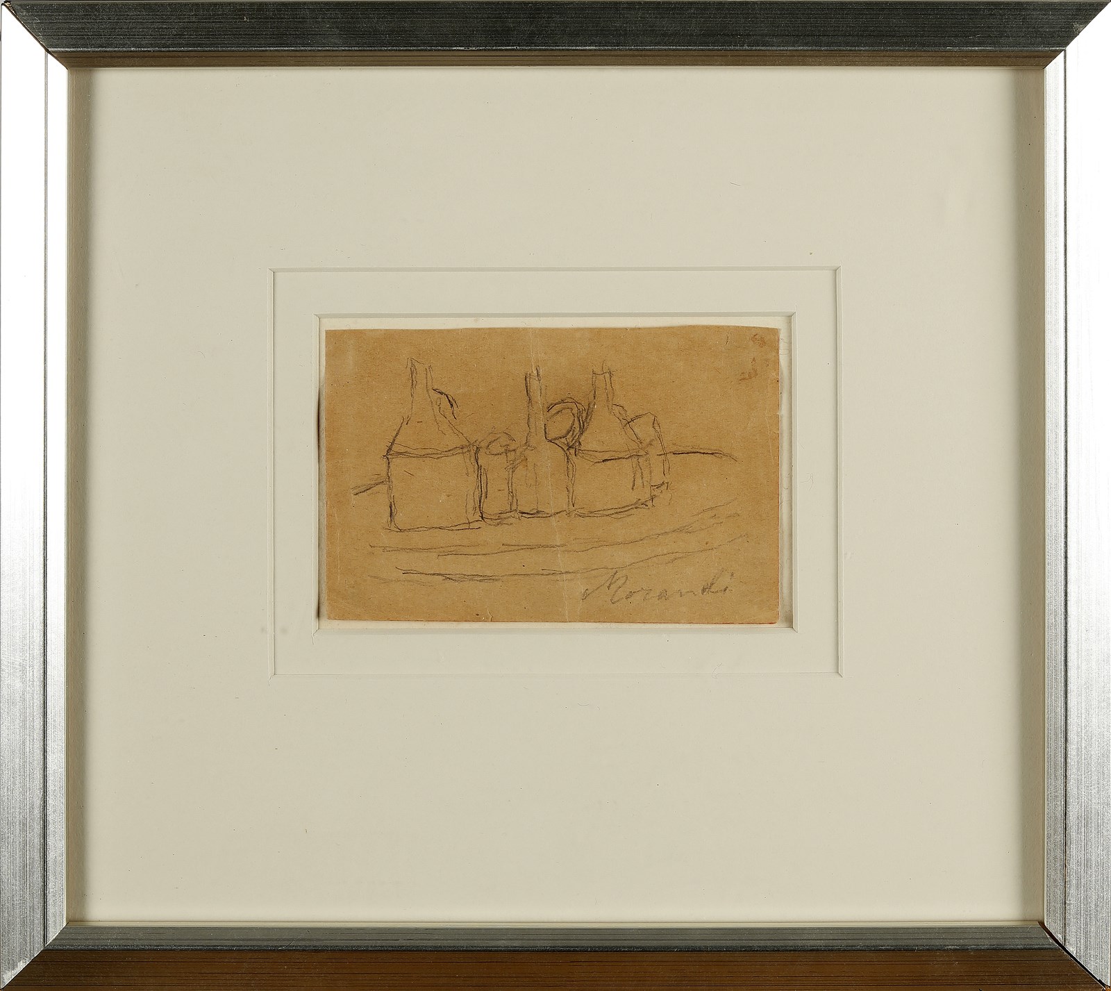 MORANDI GIORGIO (1890 - 1964) Natura morta. 1948. Matita su carta. Cm 13,00 x 9,00. Firma in basso a destra. Opera archiviata presso Centro Studi Giorgio Morandi, Bologna come da documentazione allegata all'opera riportante il relativo numero d'inventario. Sitografia: https://giorgiomorandi.it/acquisizioni-al-catalogo-generale-post-dicembre-2016/. Cornice presente