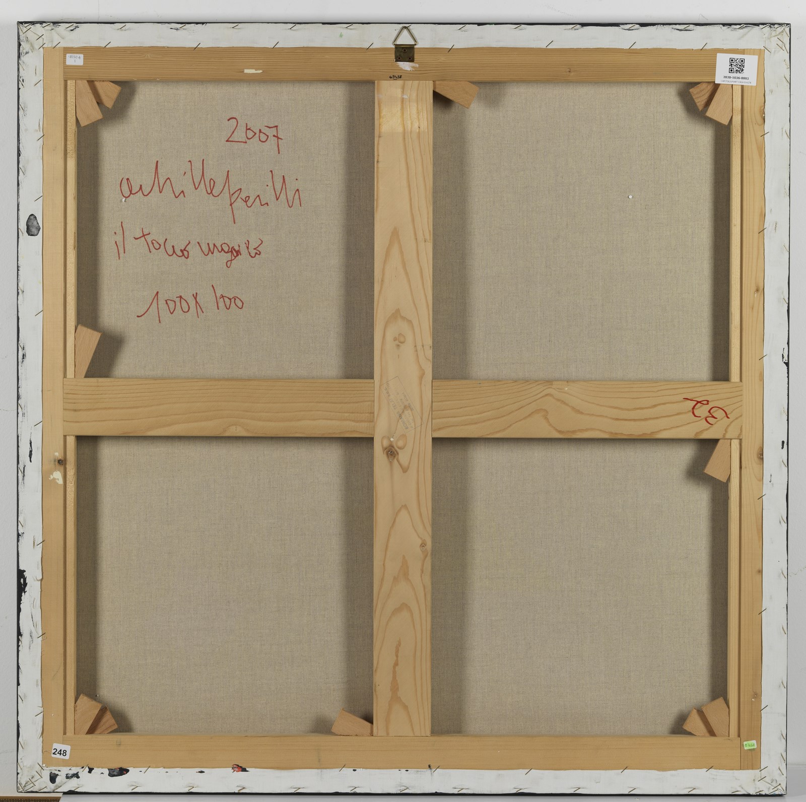 PERILLI ACHILLE (n. 1927) Il tocco magico. 2007. Tecnica mista su tela. Cm 100,00 x 100,00. Firma e anno in basso a sinistra. Al retro titolo, firma e anno. Autentica dell'artista su fotografia riportante il relativo numero d'inventario. Pubblicazione: Catalogo generale delle opere e delle sculture di Achille Perilli 1945-2016 a cura di Giuseppe Appella, Silvana Editoriale, 2019, pag. 452, ill.3234. Provenienza: Collezione Privata, Perugia. Collezione Privata, Roma. Lievi difetti.