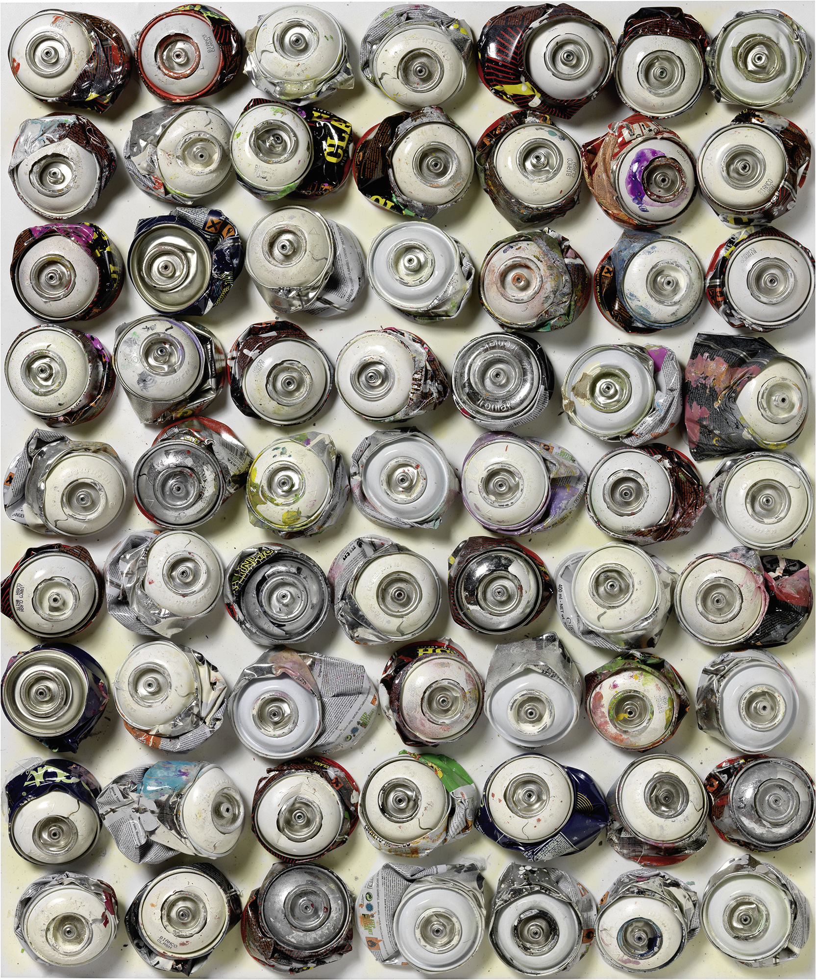 Tecnica mista e pittura su bombolette spray in teca di plexiglass, cm. 71x58,5x6,5 (teca)