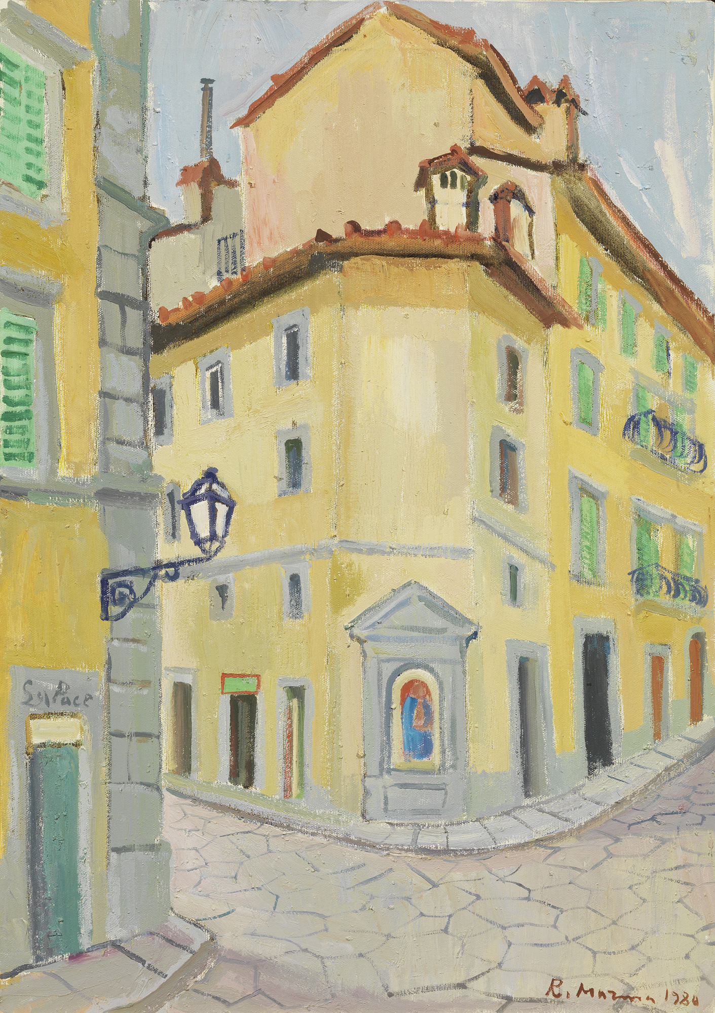 Firma e data in basso a destra: R. Marma 1980; firma, data e titolo al verso sulla tela: R. Marma 1980 / "Angolo di città" / (via Ruote e via S. Gallo).
