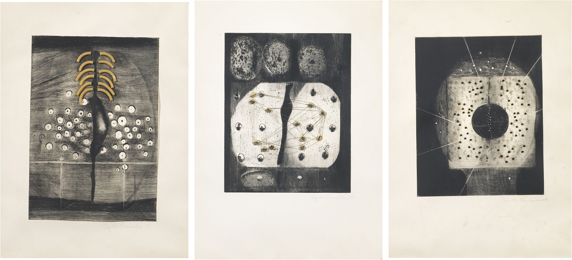 B) Senza titolo, 1964, puntasecca e collage su carta, opera unica, cm. 29,5x23,5 (lastra), cm. 50x37,5 (carta). Firma e data a matita sul margine in basso a destra: Agustin Fernandez 64. Incisione dal portfolio Lettre à un Genou, 1963, composto da sette puntesecche di Agustin Fernandez accompagnate da un testo di Alain Bosquet, tiratura di 45 esemplari più 10 prove d'artista, stampatore Lacourière et Frélaut, Parigi;