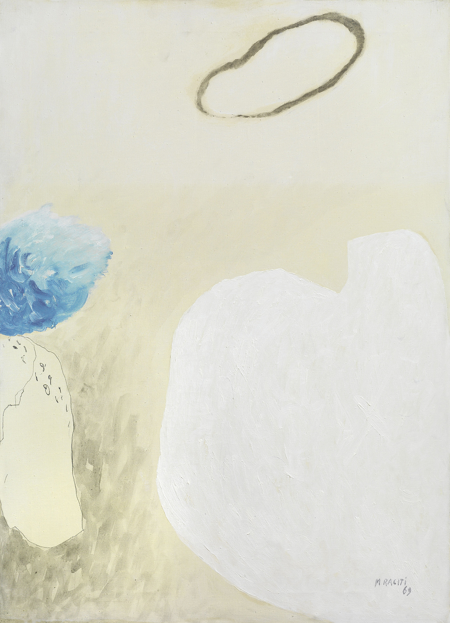 Firma e data in basso a destra: M. Raciti 69; firma, data e titolo al verso sulla tela: M. Raciti / 69 / Presenze - Assenze: etichetta con n. 30768 e timbro Galleria Annunciata, Milano.