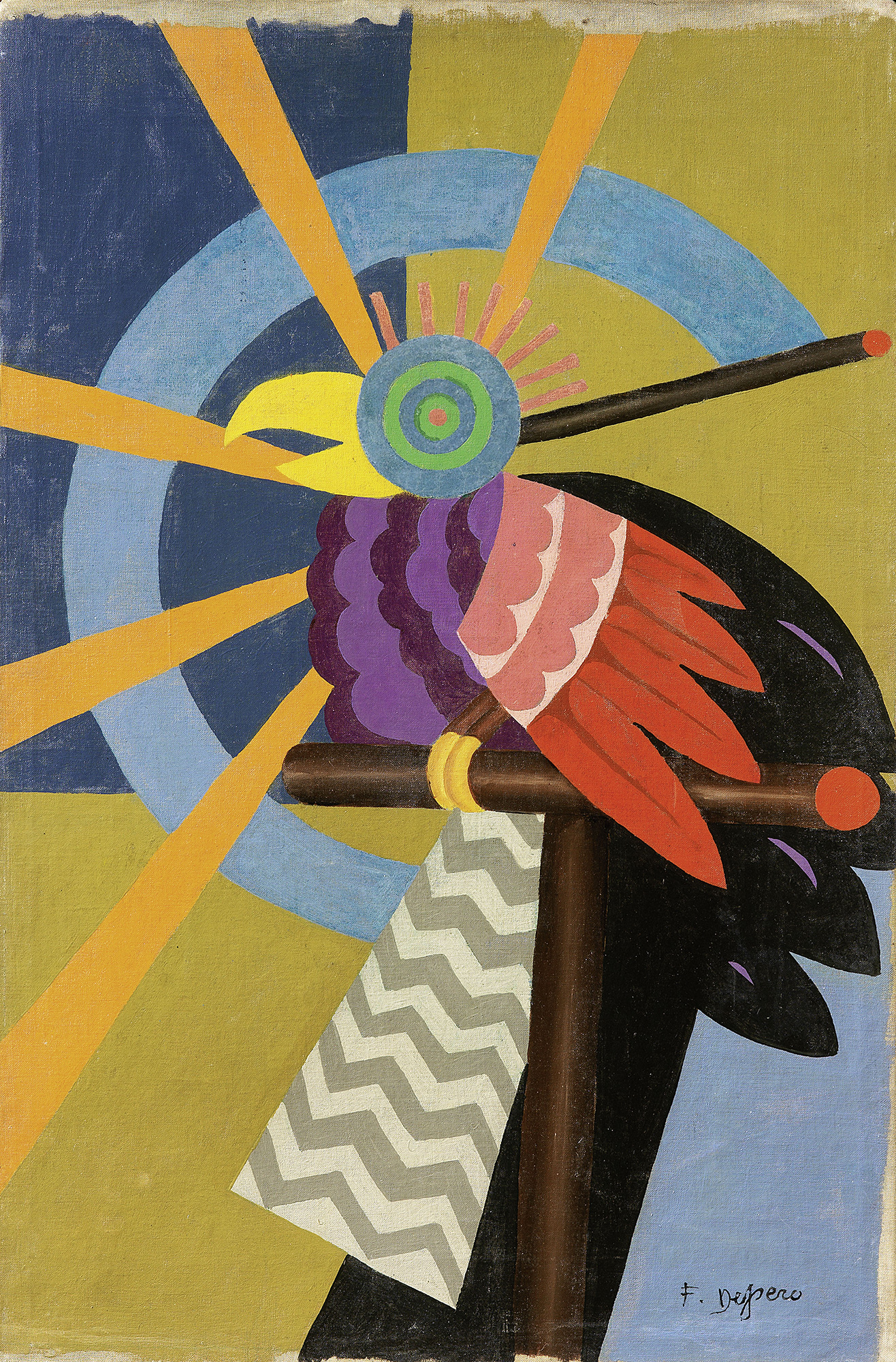 Firma in basso a destra: F. Depero. Al verso sul telaio: etichetta Martano / Gallerie in Torino: etichetta Galleria d'Arte Contemporanea Peccolo / Livorno / Cat. n. 20 / n. 004: etichetta con timbro Galleria d'Arte Narciso: due timbri Galleria Pancheri, Rovereto; sulla tela dichiarazione di autenticità: Opera eseguita da mio marito / Fortunato nel 1920 / In fede / Rosetta Amadori Depero / Rovereto 13-3-1971. Opera registrata presso l'Archivio Unico per il Catalogo delle Opere Futuriste di Fortunato Depero, al n. FMD-0461-DIP. Esposizioni Fortunato Depero. Opere 1914 - 1953, a cura di Maurizio Scudiero, Cortina d'Ampezzo, Galleria d'Arte Frediano Farsetti, 9 - 31 agosto 2008, poi Milano, Farsettiarte, 18 settembre - 15 ottobre 2008, cat. n. 11, illustrato a colori; Firenze-New York. Rinascimento e Modernità. Da Luca Signorelli a Andy Warhol, Firenze, Galleria d'Arte Frediano Farsetti, 30 settembre - 10 dicembre 2011, cat. n. 14, illustrato a colori.