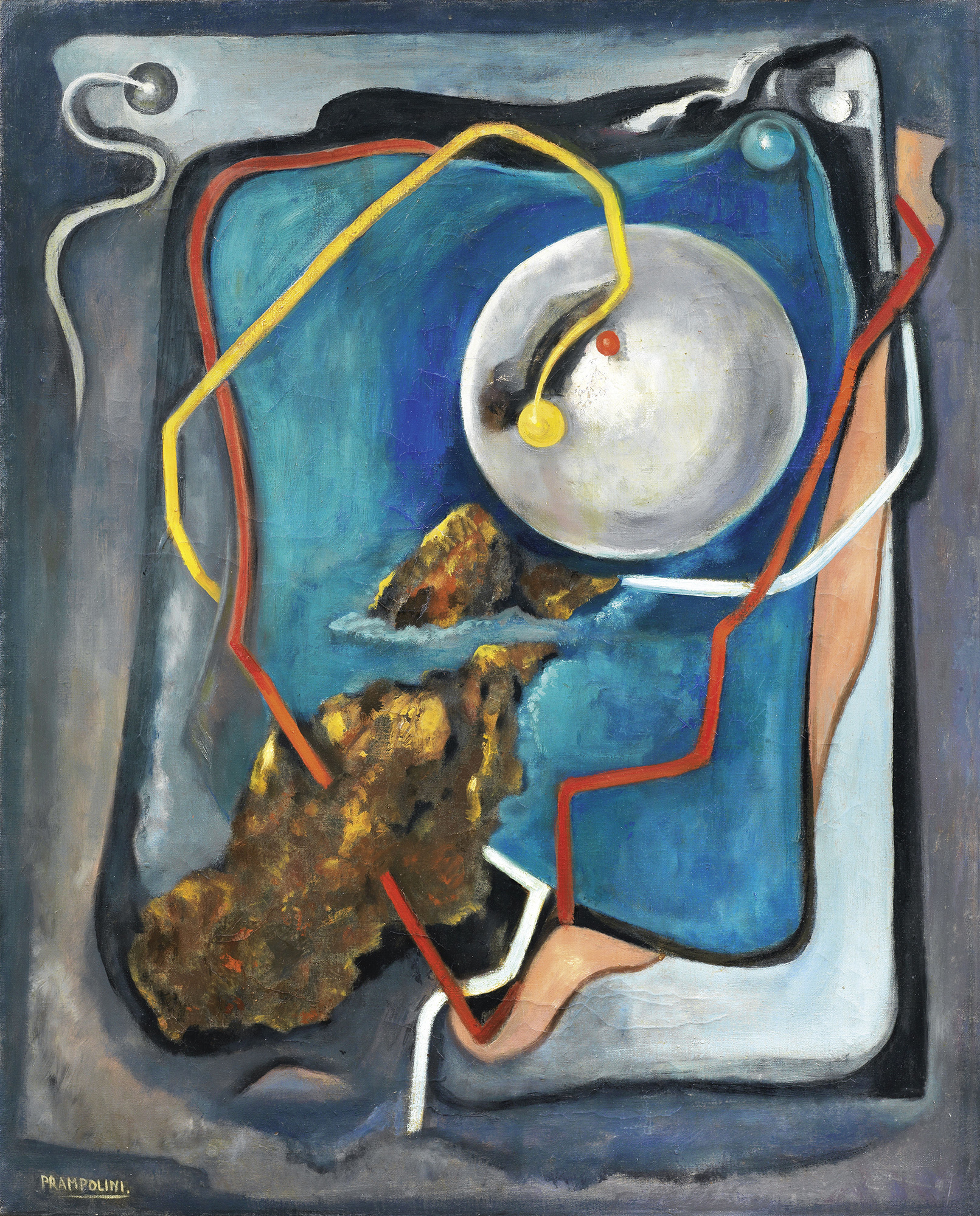 Firma in basso a sinistra: Prampolini. Al verso sul telaio: etichetta Galeria Müller, Buenos Aires. Storia Collezione Bettini, Roma-Buenos Aires; Collezione Visconti, Roma; Collezione privata Certificato su foto di Massimo Prampolini, Roma, 14 marzo 2015. Esposizioni Abstracta, da Balla alla Street Art, a cura di Giuseppe Stagnitta, Giancarlo Carpi e Raffaella Bozzini, Noto, Museo Gagliardi, 15 giugno - 30 settembre 2018, cat. p. 54, illustrato a colori; Futurism senza tema, a cura di Giancarlo Carpi, Roma, Futurism & Co Art Gallery, 15 maggio - 15 settembre 2019, illustrato a colori.