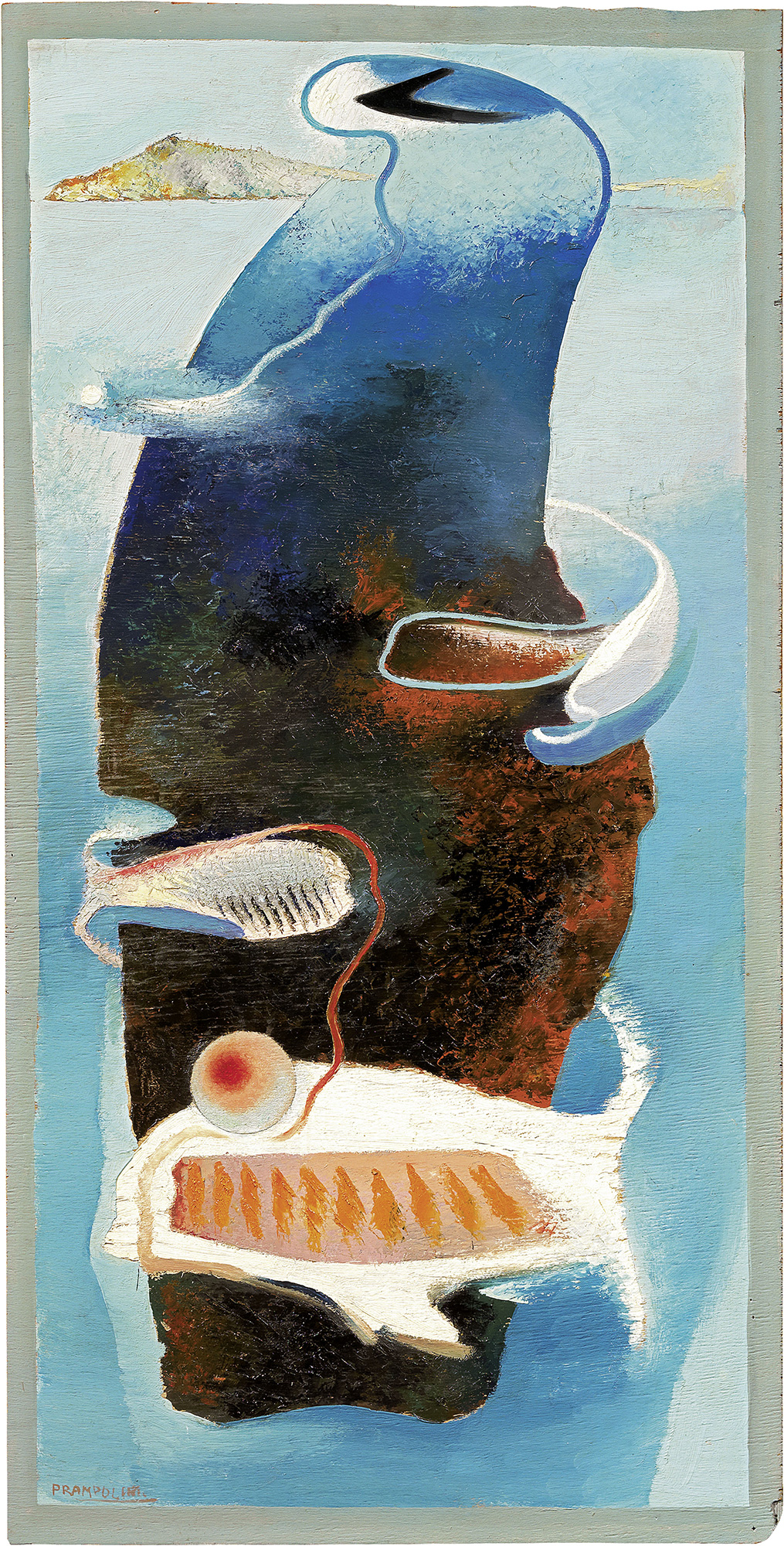 Firma in basso a sinistra: Prampolini; dedica e firma al verso: All'amico Angelo Celesia / in segno d'amicizia / Enrico Prampolini / [Roma] 1942: etichetta II Quadriennale d'Arte Nazionale / Roma / MCMXXV (opera datata 1925): etichetta e due timbri Arte Centro, Milano, arch. A.C. 8571; su un pannello di supporto: etichetta Enrico Prampolini / Natura aerodinamica, 1932 ca. / Futur-ism 514 / Massimo Carpi / 3B Anni Trenta Quaranta. Storia Collezione privata, Roma; Collezione privata Esposizioni Omaggio a E. Prampolini 1894 - 1956, a cura di Filiberto Menna, Bergamo, Galleria Lorenzelli, marzo - aprile 1967, illustrato; Futurismo 1909-1944, Roma, Palazzo delle Esposizioni, 7 luglio - 22 ottobre 2001, cat. p. 362, illustrato a colori; Enrico Prampolini, Milano, Arte Centro, novembre 2002 - gennaio 2003, cat. n. 12, illustrato a colori; Fini & Confini. Dal Paesaggio al Territorio. Opere da una collezione privata, 23 febbraio - 18 maggio 2019, cat. p. 56, illustrato a colori.
