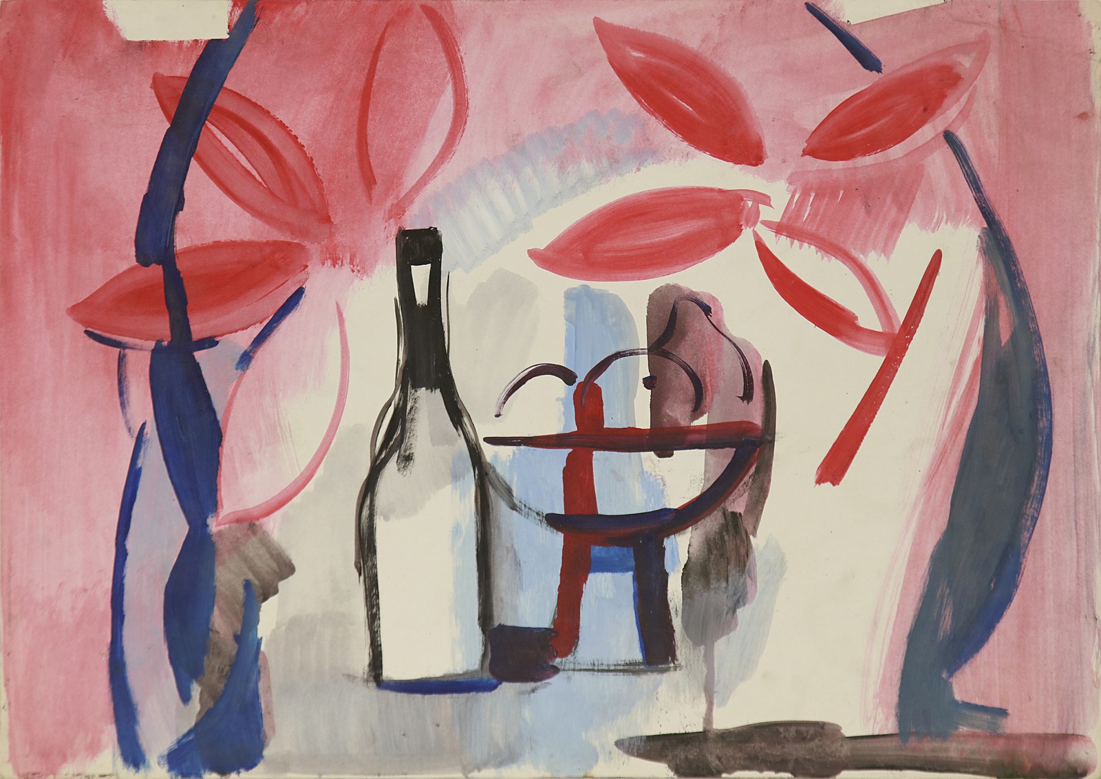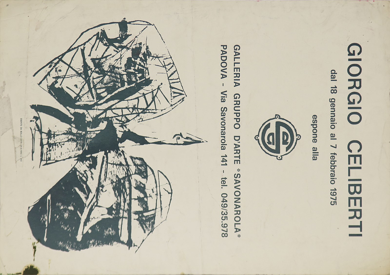 CELIBERTI GIORGIO (n. 1929) Senza titolo. Tecnica mista su carta. Cm 70,00 x 50,00. Disegno realizzato al retro del manifesto originale della mostra Giorgio Celiberti, 18 Gennaio -7 Febbraio 1975, Galleria gruppo d'arte Savonarola, Padova.