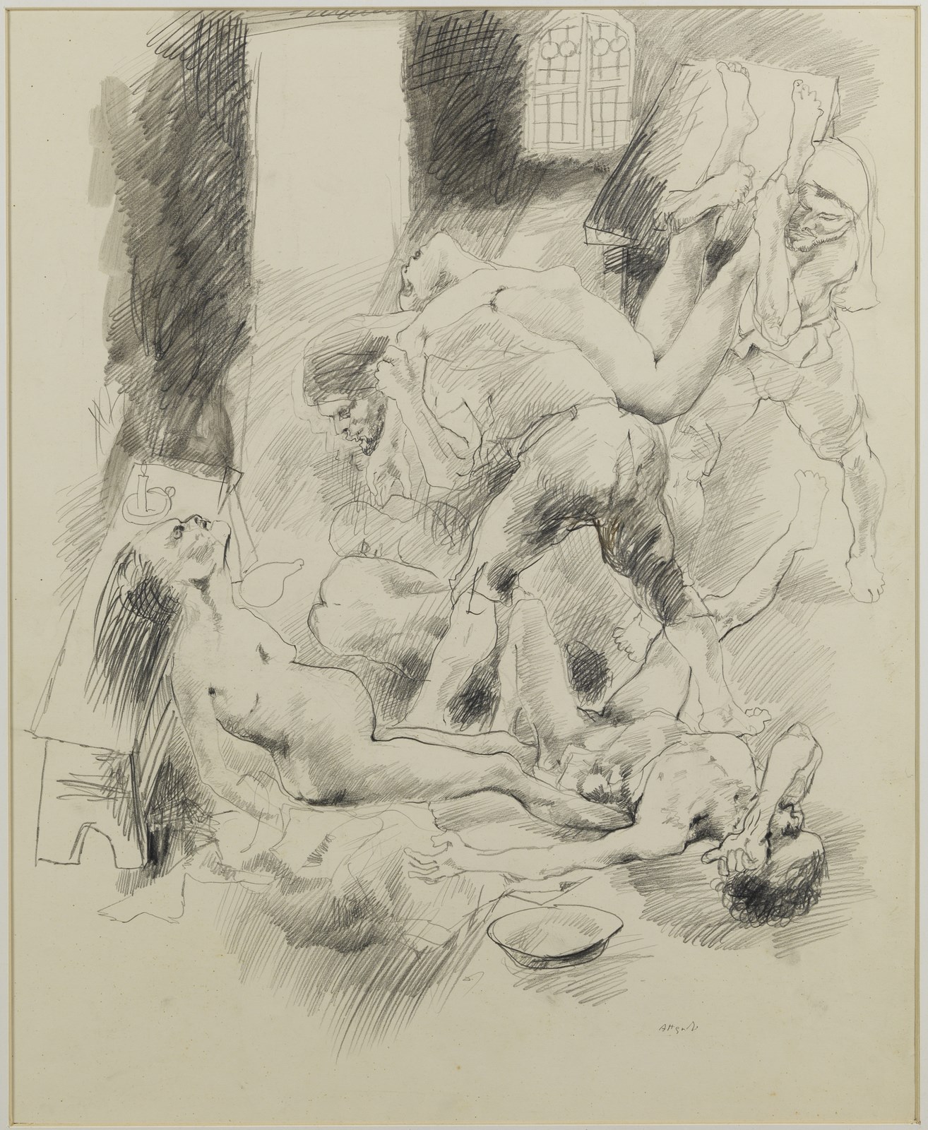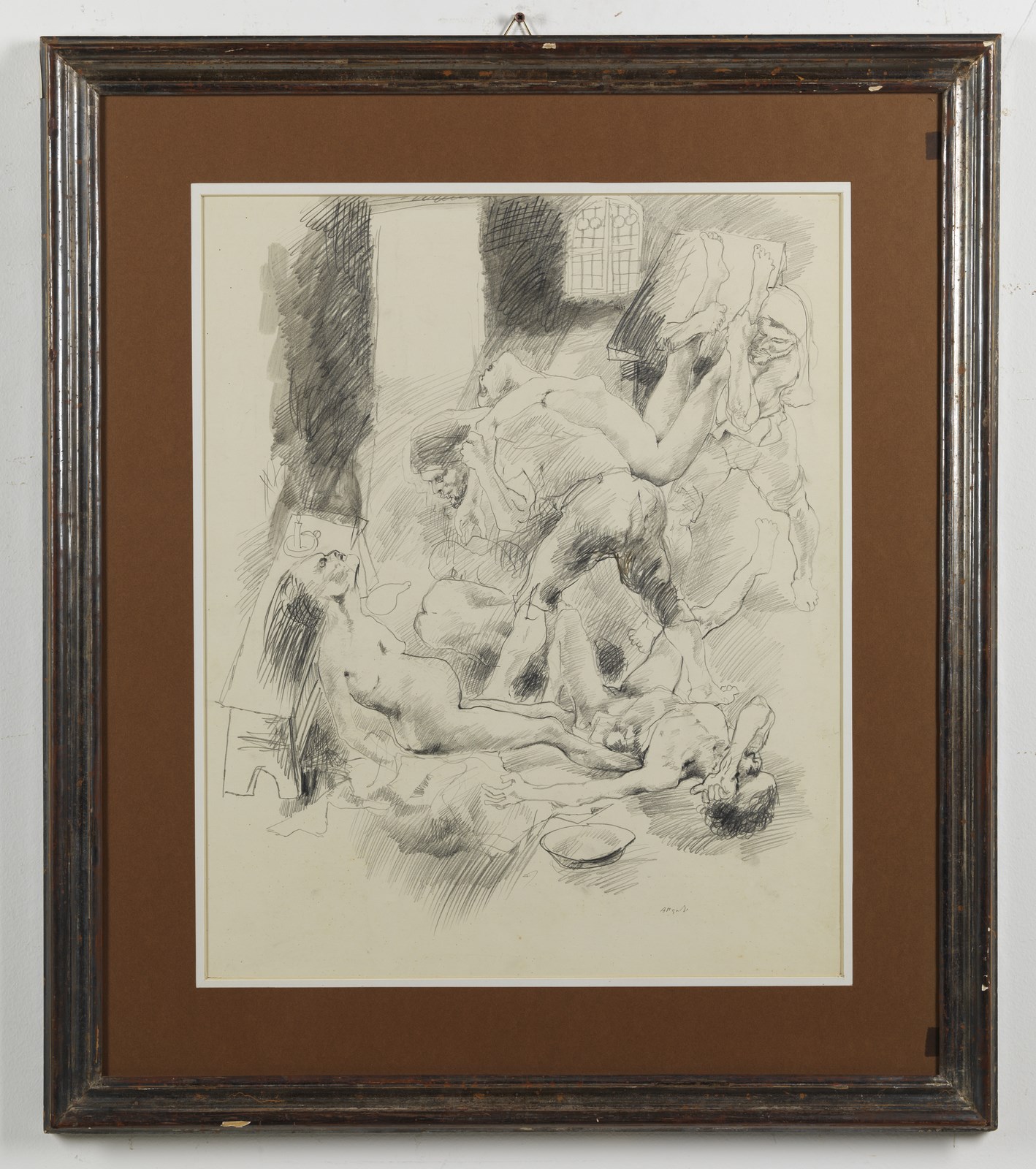 ATTARDI UGO (1923 - 2006) Malati. Tecnica mista su carta. Cm 48,00 x 59,00. Firma in basso a destra. Lievi difetti. Cornice presente