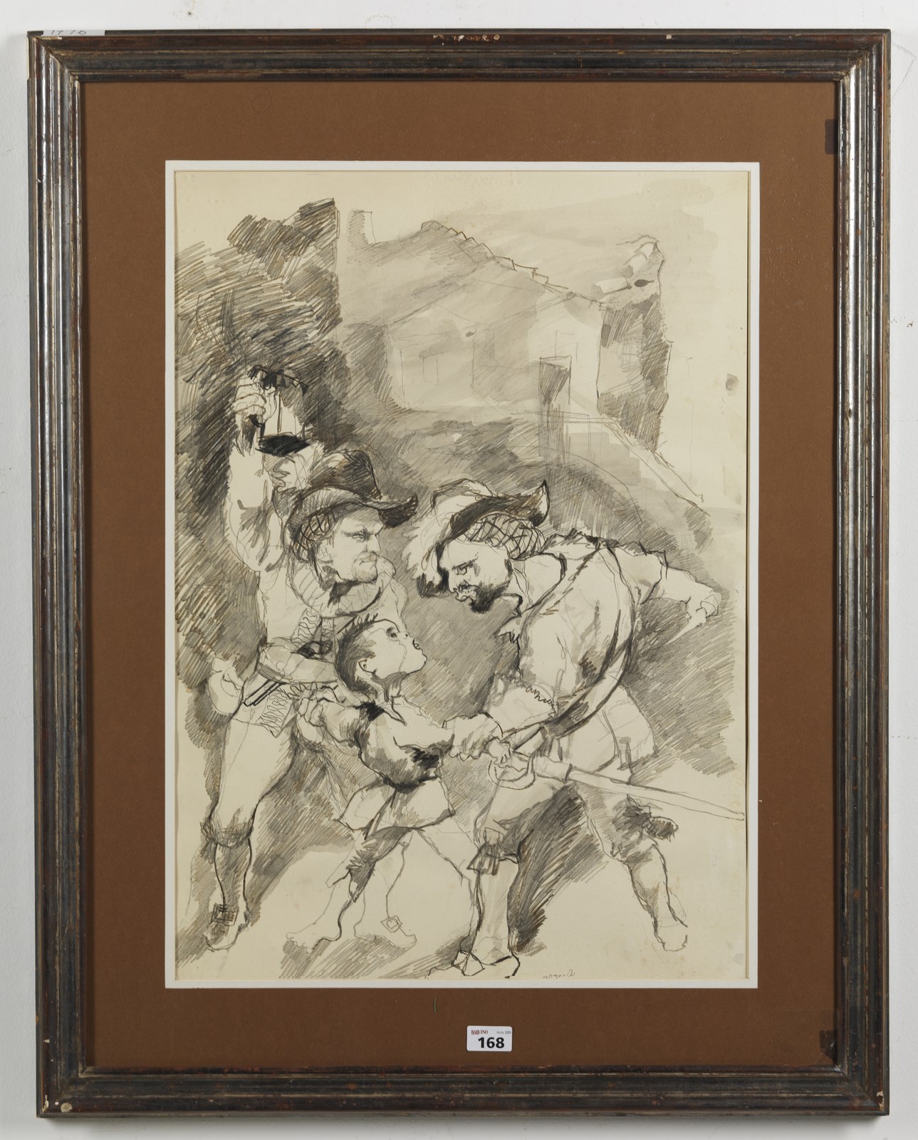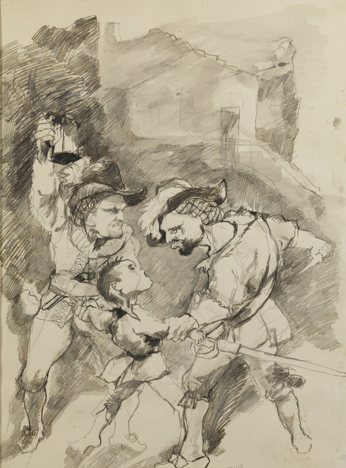 ATTARDI UGO (1923 - 2006) I bravi. Tecnica mista su carta. Cm 48,00 x 68,00. Firma e titolo in basso a destra. Lievi difetti. Cornice presente