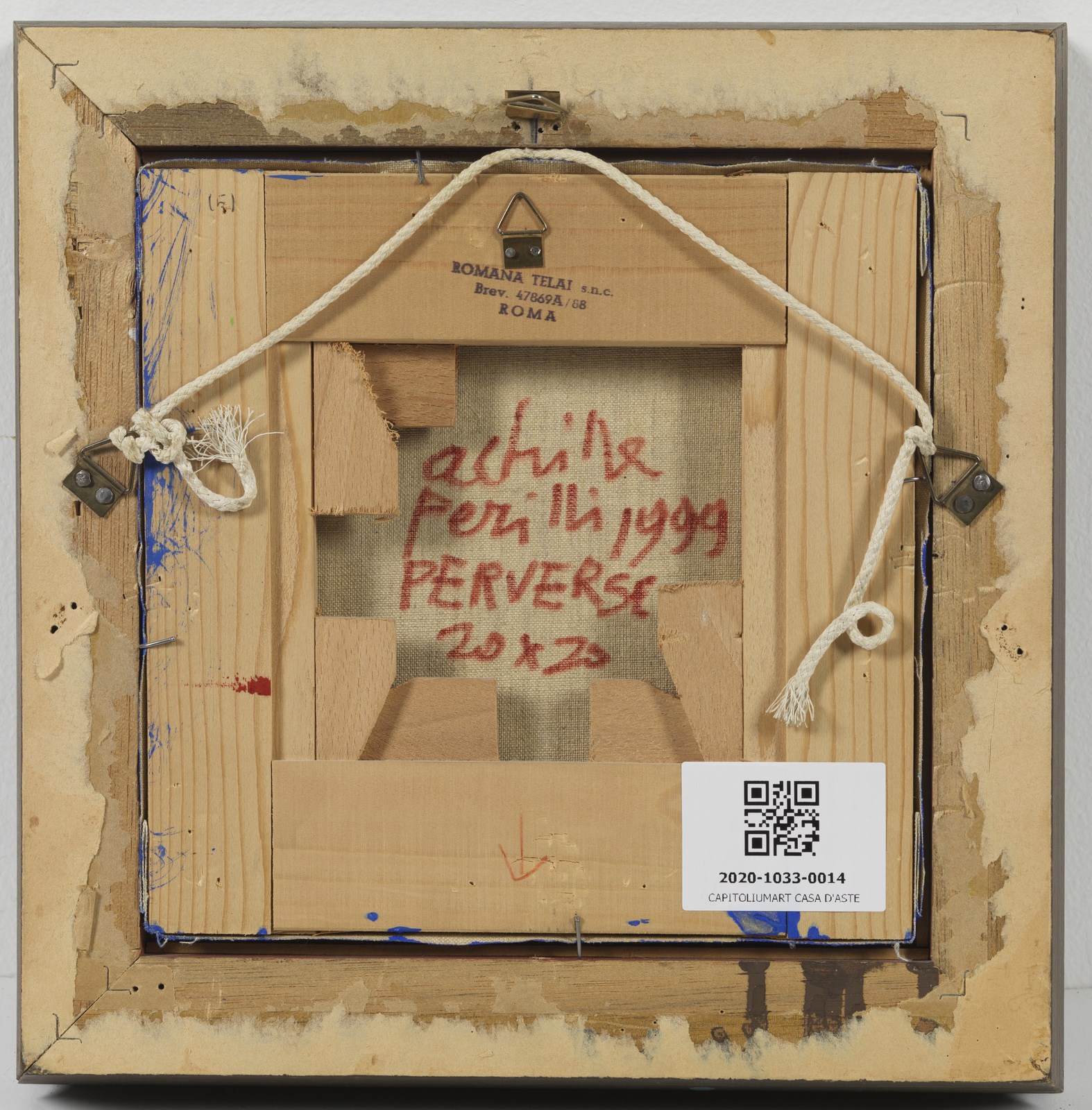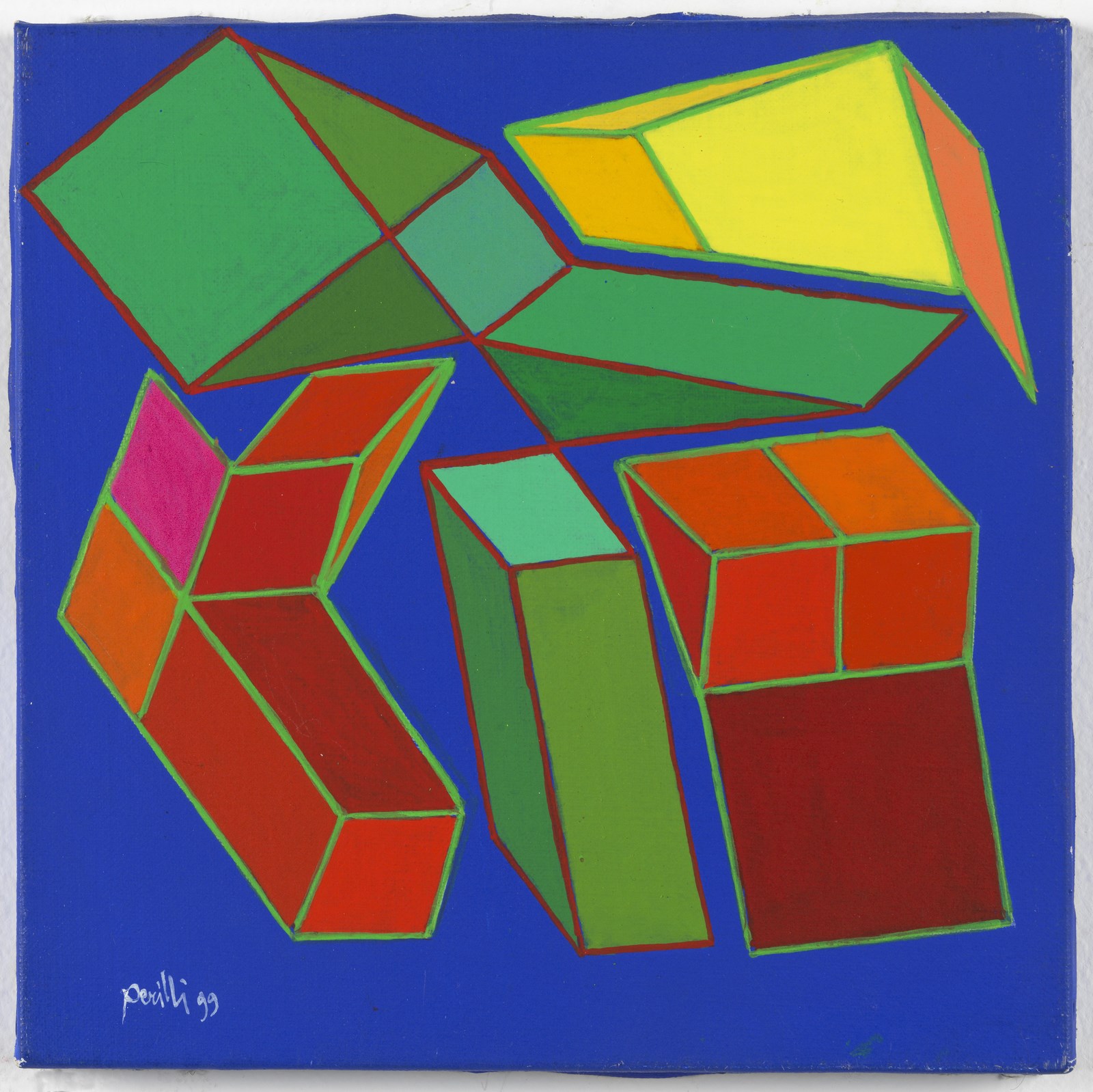 PERILLI ACHILLE (n. 1927) Perverse. 1999. Tecnica mista su tela. Cm 20,00 x 20,00. Firma e anno in basso a sinistra. Al retro titolo, firma e anno. Autentica dell'artista su fotografia riportante il relativo numero d'inventario. Pubblicazione: Catalogo generale delle opere e delle sculture di Achille Perilli 1945-2016 a cura di Giuseppe Appella, Silvana Editoriale, 2019, pag. 319, ill.2120. Provenienza: Galleria Free Time Club, Cesena. Collezione privata, Roma. Cornice presente