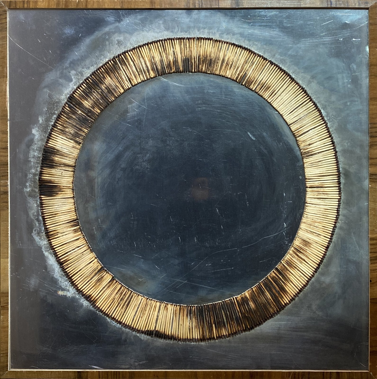 AUBERTIN BERNARD (1934 - 2015) Dessin de feu circulaire. 2009. Fiammiferi bruciati su alluminio. Cm 50,00 x 50,00. Firma e anno al retro. Opera archiviata presso l'Archivio Aubertin, Brescia, coma documentazione fotografica allegata all'opera riportante il relativo numero d'inventario.