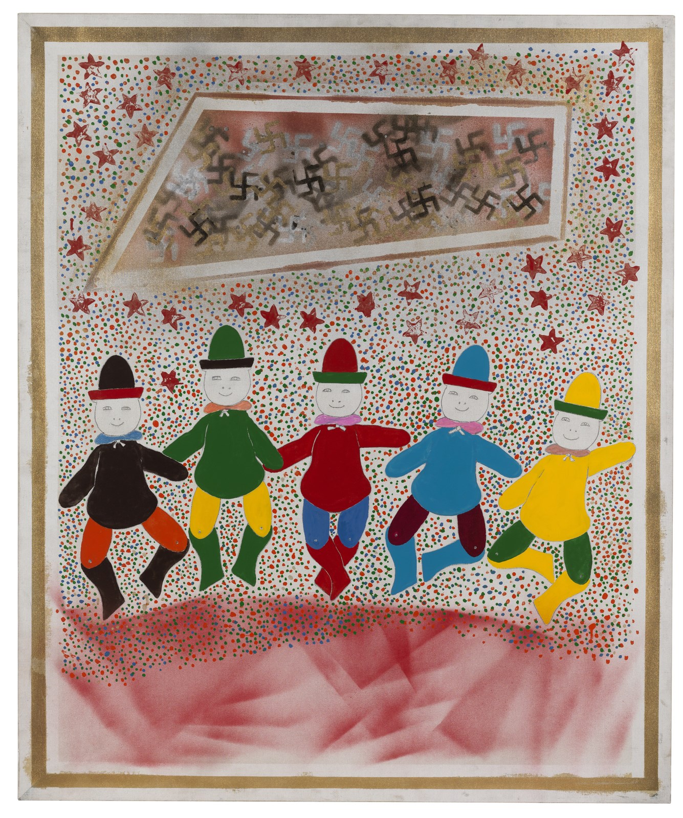 ANGELI FRANCO (1935 - 1988) Marionette. Tecnica mista su tela. Cm 99,50 x 120,00. 1985/1988. Firma e titolo al retro. Opera archiviata presso l'Archivio Franco Angeli, Roma come da documentazione fotografica allegata all'opera riportante il relativo numero d'inventario.