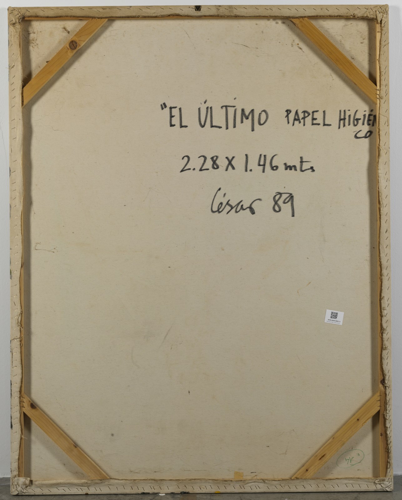 DELGADO BENITEZ CESAR (n. 1961) El ultimo papel... 1989. Olio su tela . Cm 228,00 x 146,00. Al retro firma, titolo e anno. Autentica dell'artista su fotografia.