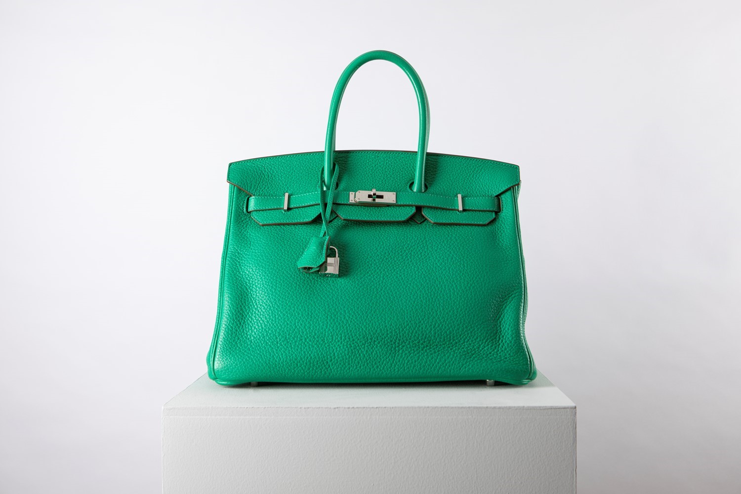 in pelle taurillon clemence color verde menta, dettagli in palladio e parti con pellicole protettive, con sacchetto (lievissimi difetti).