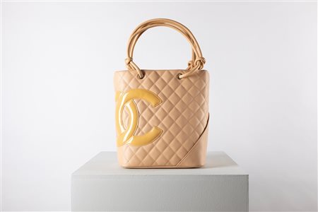 in pelle trapuntata color pesca, marchio in vernice e interno in tessuto tecnico color arancio, cm 20 x 24, con sacchetto (lievi difetti).