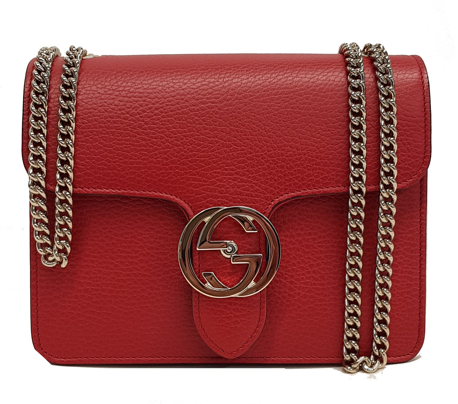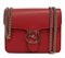 in pelle color rosso, doppio scomparto interno, dettagli in metallo dorato e logato, tracolla e catena, cm 20, con sacchetto.