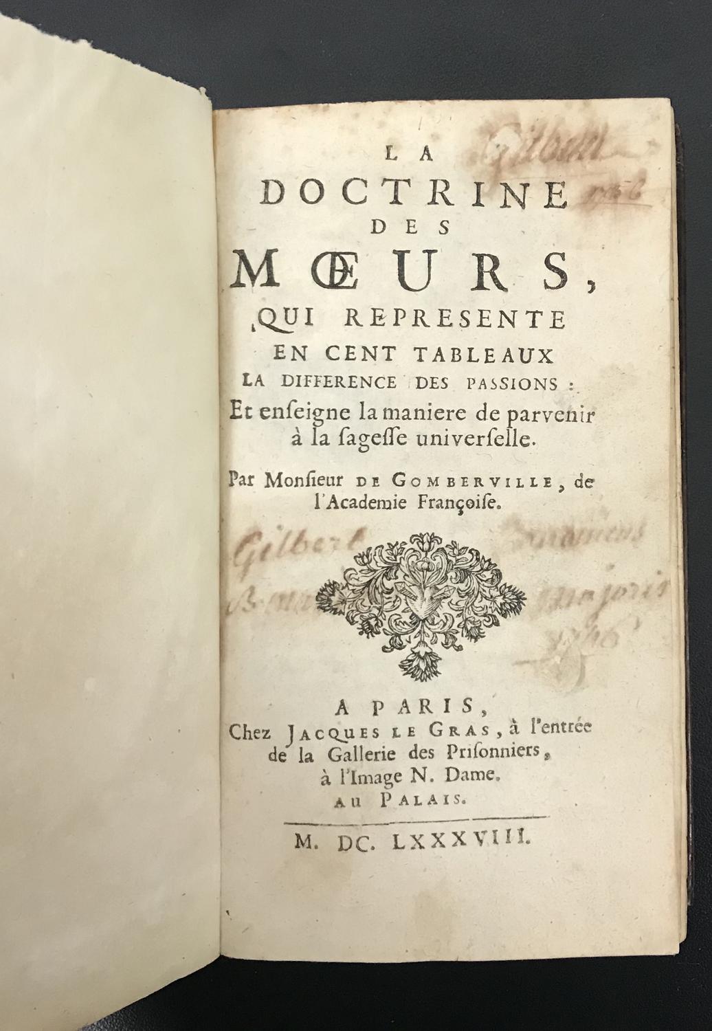 GOMBERVILLE, MONSIEUR DE. LA DOCTRINE DES MOEURS, QUI REPRéSENTE EN CENT TABLEAUX, LA DIFFéRENCE DES PASSIONS : ET ENSEIGNE LA MANIèRE DE PARVENIR ΐ LA SAGESSE UNIVERSELLE. A PARIS CHEZ JACQUES LE GRAS, 1688
