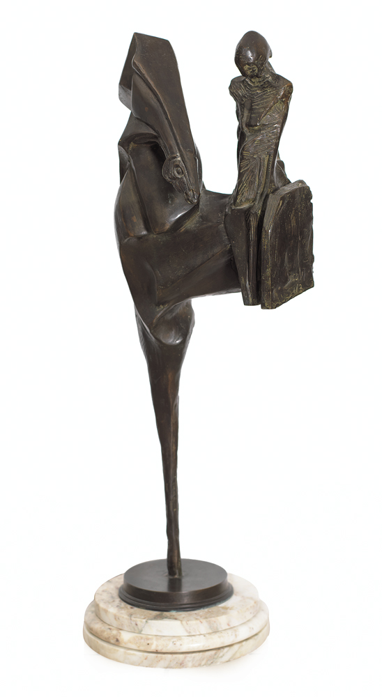 CLAUDIO NICOLI San Giovanni in Persiceto (BO) 1958 Cavallo e cavaliere scultura in bronzo poggiante su base circolare in marmo cm. 84x28x23, esemplare 1/3, firma e tiratura sulla destra, dichiarazione d'autenticità dell'artista su foto.
