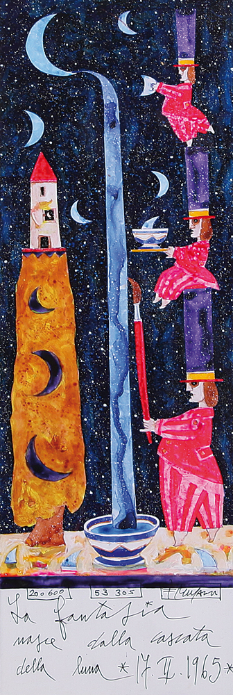 FRANCESCO MUSANTE Genova 17/02/1950 La fantasia nasce dalla cascata della luna, 2004 tecnica mista su tavola cm. 60x20, firma in basso a destra, dichiarazione d'autenticità e archivio dell'artista su foto.
