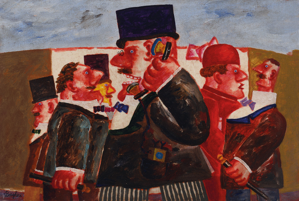FRANZ BORGHESE Roma 21/01/1941 - Roma 17/12/2005 Il telefono, metà anni '90 olio su tela cm. 30x45, firma in basso a sinistra, titolo e firma al retro, dichiarazione d'autenticità dell'artista su foto, opera registrata nell'archivio dell'artista come da certificato allegato.
