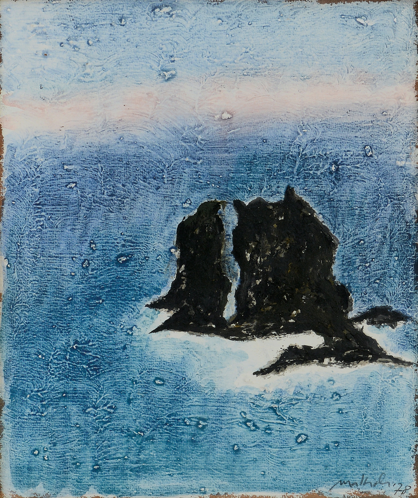 CARLO MATTIOLI Modena 08/05/1911 - Parma 12/07/1994 Isola, 1978 tecnica mista su cartone cm. 30x25, firma e anno in basso a destra, timbro e firma per autenticità del perito artistico Renzo Furlotti su foto, dichiarazione d'autenticità dell'artista e Archivio Carlo Mattioli (PR) su foto.